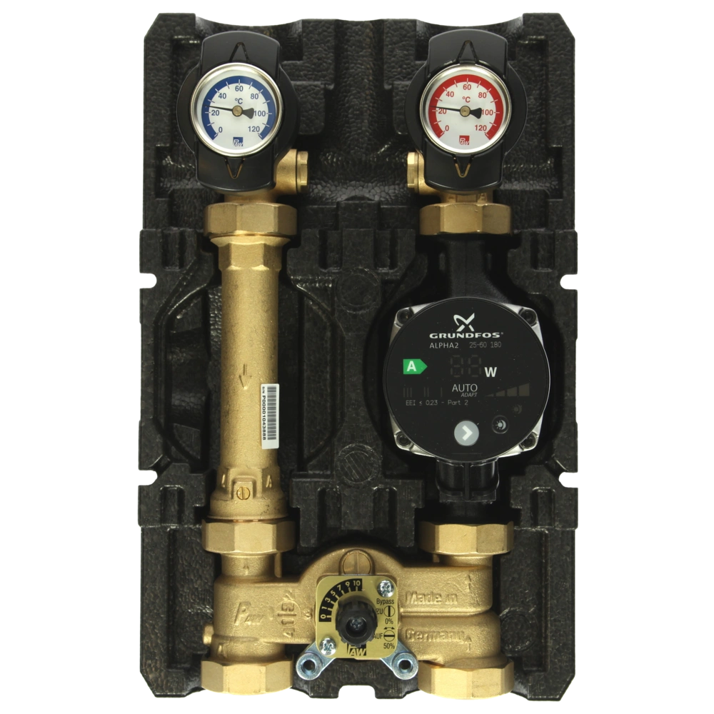 Inoltre, il miscelatore è dotato di un sistema di controllo della pressione che consente di ridurre il rumore.Inoltre, anche la conversione del miscelatore può essere effettuata senza problemi. Il dispositivo antiriflusso integrato nel miscelatore impedisce una circolazione errata. Il miscelatore a 3 vie è dotato di un bypass regolabile al quale è possibile aggiungere fino al 50% dell'acqua di ritorno dal circuito di riscaldamento (a seconda dell'impianto). Tutte le parti del circuito di riscaldamento che trasportano l'acqua sono in ottone. Il termometro interamente in metallo è rimovibile ed è dotato di un manicotto di immersione integrato nella valvola a sfera. Il circuito di riscaldamento modulare è avvitato a tenuta piatta ovunque e la pompa può essere completamente chiusa, il che significa che non è necessario svuotare l'impianto durante la manutenzione.
