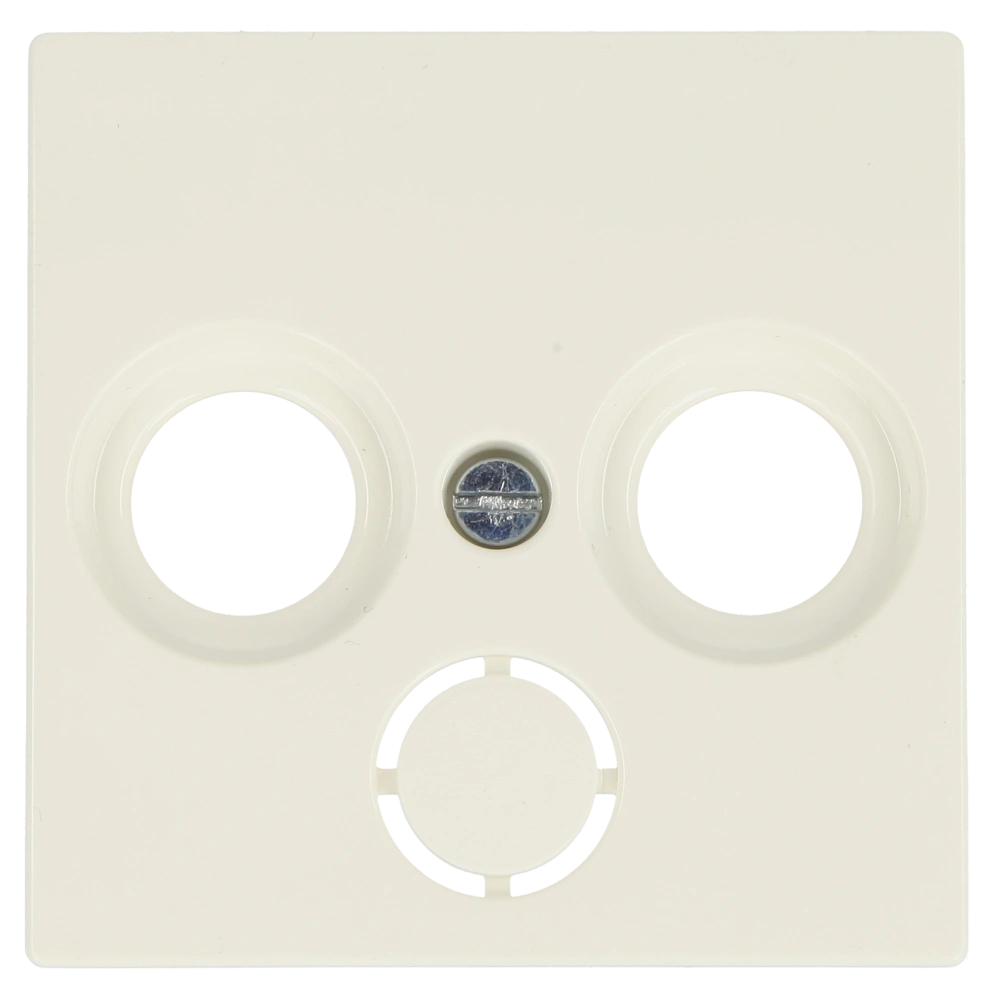 Zentralscheibe mit zwei Anschlüssen und zentraler Befestigung als Abdeckung für Antennensteckdosen TV/SAT zur Unterputz-Installation. Die dritte Öffnung kann bei Bedarf herausgebrochen werden.