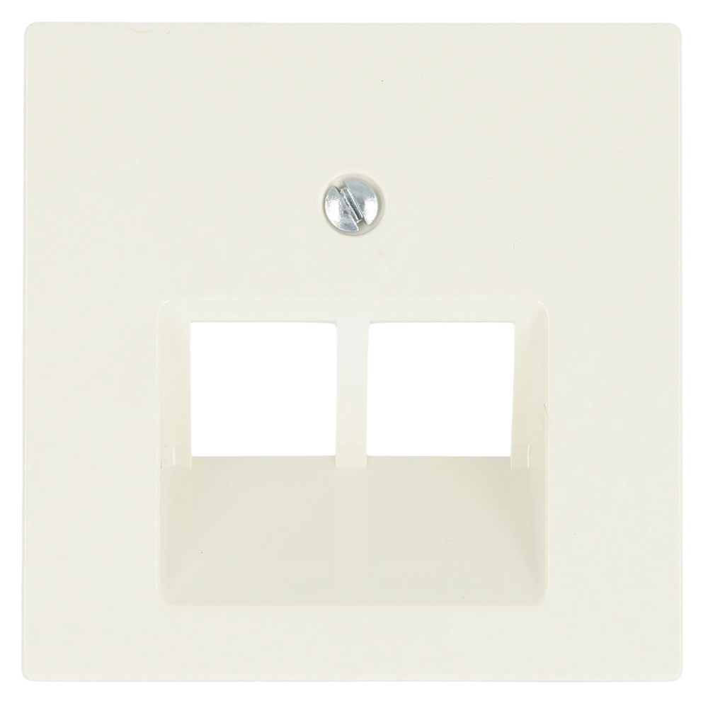 Zentralplatte mit zwei Schrägauslässen als Abdeckung für Netzwerkdosen zur Unterputz-Installation.