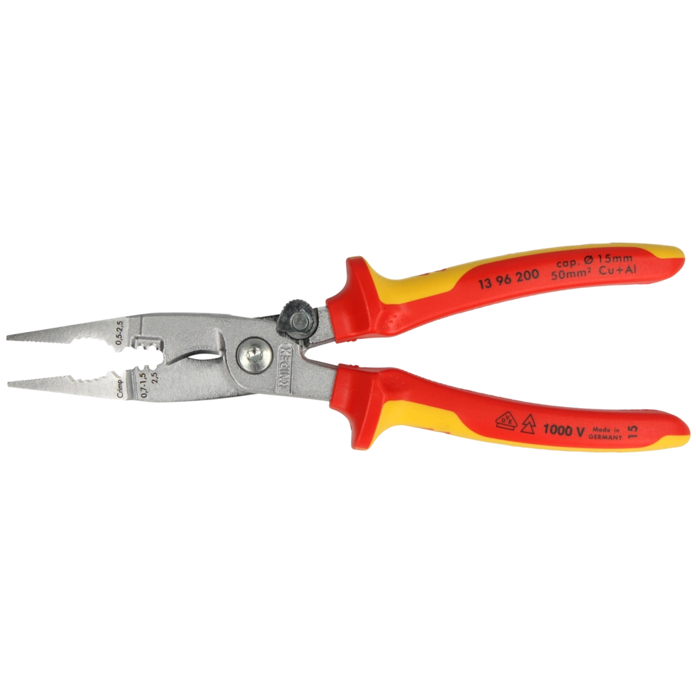 La pinza multifunzionale per installazioni elettrici. Un multitool con molte funzioni. Prendere materiali tondi e piatti. Con tagliacavi per cavi fino a 5 x 2,5 mm². Grazie ai fori d'isolamento si può lavorare su fili singoli da 0,5-2,5 mm². Nella stessa area si può pressare dei terminale capoguaina. Fori di passaggio al quadro di distribuzione si lasciano sbavare con gli angoli esterni delle ganasce. Una lama di blocco evitano che la pinza sia sempre aperta nella borsa portattrezzi.