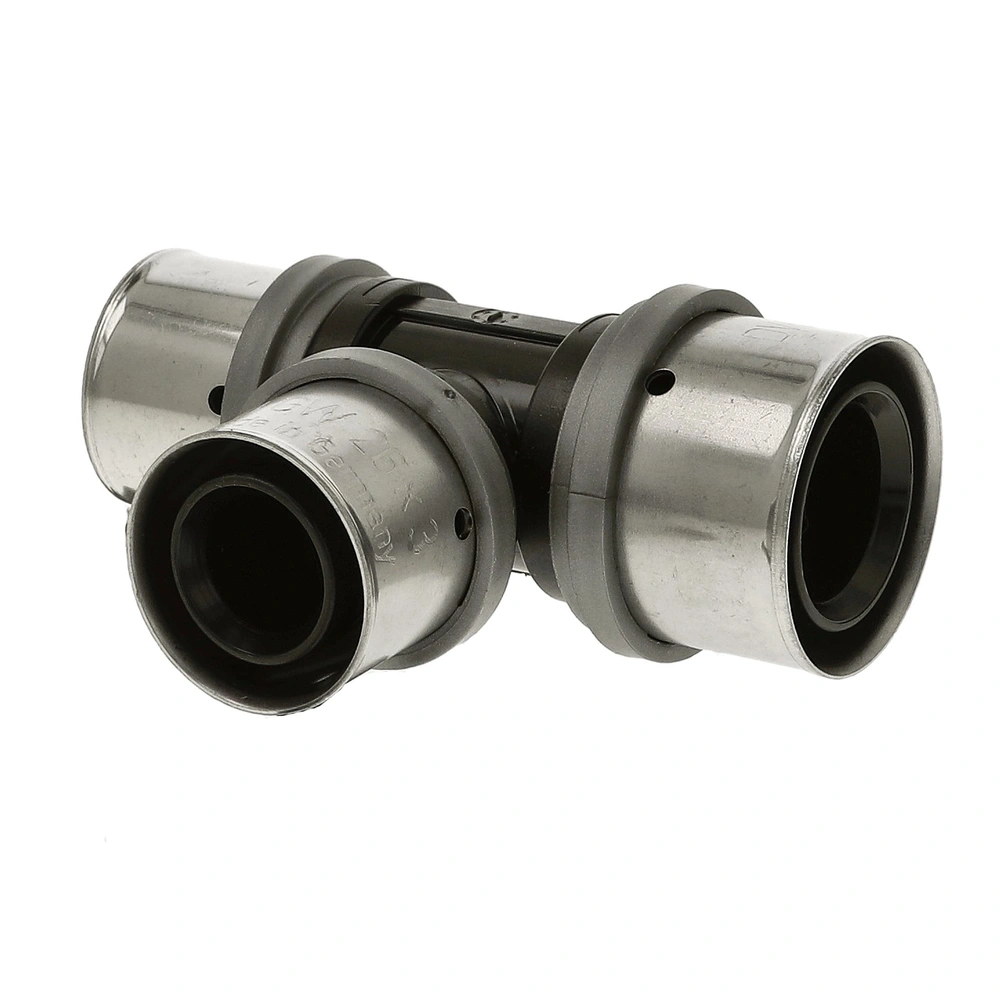 Raccordo a pressare realizzato in materiale plastico ad alte prestazioni, il polifenilsulfone, con eccezionali caratteristiche di resistenza meccanica e alla corrosione. Questo raccordo offre enormi vantaggi, in termini di praticità e velocità, semplicità di montaggio con affidabilità e sicurezza della tenuta nel tempo. Il raccordo in PPSU senza piombo è dotato di due o-ring e tre finestre di controllo per vedere se il tubo multistrato ha raggiunto la corretta posizione di inserimento prima della pressatura. Grazie al multiprofilo, questo raccordo a compressione può essere utilizzato indifferentemente con 2 profili di pressatura, il profilo TH per tutte le grandezze e il profilo U per tubi con sezione da 16 a 32 mm. Il rigido anello fermabussola in plastica garantisce una salda pressatura in qualsiasi posizione di montaggio. Durante il controllo della tenuta il raccordo non pressato perde. Ciò consente individuare ed eliminare perdite durante la prova di tenuta. Grazie al libero flusso attraverso la giunzione, il raccordo a pressare riduce al minimo le perdite di carico e non si sentono rumori di flusso fastidiosi.