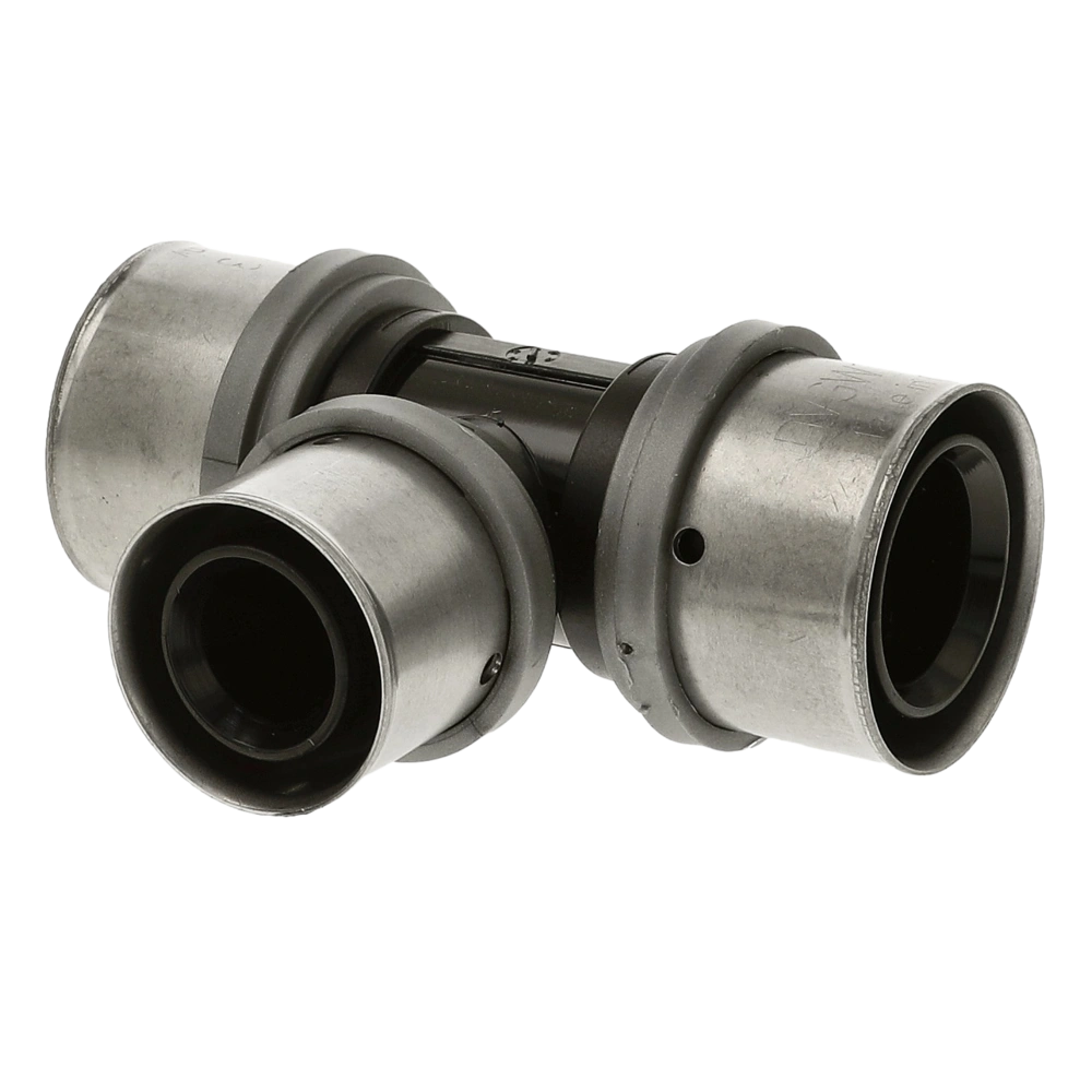 Raccordo a pressare realizzato in materiale plastico ad alte prestazioni, il polifenilsulfone, con eccezionali caratteristiche di resistenza meccanica e alla corrosione. Questo raccordo offre enormi vantaggi, in termini di praticità e velocità, semplicità di montaggio con affidabilità e sicurezza della tenuta nel tempo. Il raccordo in PPSU senza piombo è dotato di due o-ring e tre finestre di controllo per vedere se il tubo multistrato ha raggiunto la corretta posizione di inserimento prima della pressatura. Grazie al multiprofilo, questo raccordo a compressione può essere utilizzato indifferentemente con 2 profili di pressatura, il profilo TH per tutte le grandezze e il profilo U per tubi con sezione da 16 a 32 mm. Il rigido anello fermabussola in plastica garantisce una salda pressatura in qualsiasi posizione di montaggio. Durante il controllo della tenuta il raccordo non pressato perde. Ciò consente individuare ed eliminare perdite durante la prova di tenuta. Grazie al libero flusso attraverso la giunzione, il raccordo a pressare riduce al minimo le perdite di carico e non si sentono rumori di flusso fastidiosi.