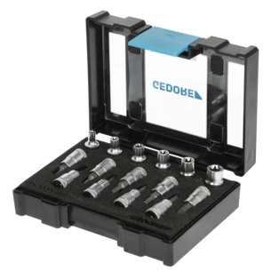 Prolunga per bussola portainserti ad azionamento manuale con attacco quadro La bussola portainserti e gli inserti sono tenuti fermo tramite una sfera di fermo.