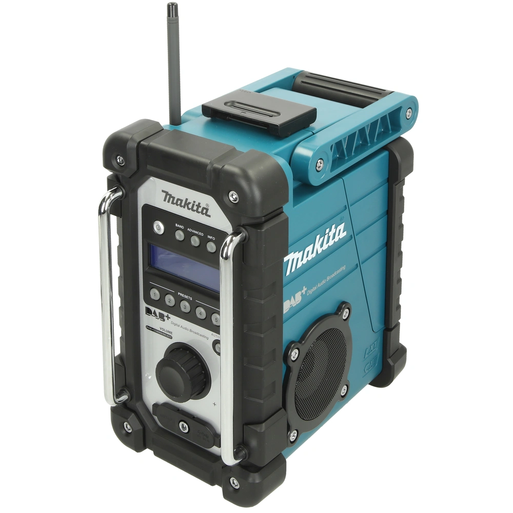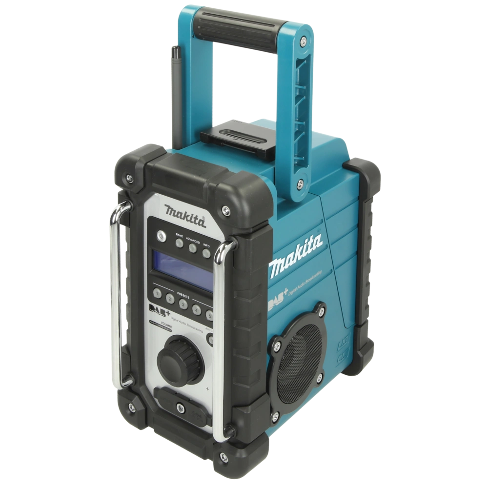 La radio da cantiere Makita è un compagno ideale sul cantiere e per lavori in movimento. È dotata di una custodia robusta, che è anche a prova di schizzi. Per un alimentazione permanente, è incluso un adattatore di alimentazione, ma non per la ricarica. Tutte le batterie Makita da 7,2 - 18 V e le nuove batterie scorrevoli da 10,8 V possono essere utilizzate. I trasmettitori sono regolabili in modo digitale tramite un ampio display nella range di frequenza DAB, DAB+ e UKW. Per il collegamento di altri fonti d'audio esistono 2 boccole AUX-In. Inoltre, la radio ha una funzione di allarme integrata.