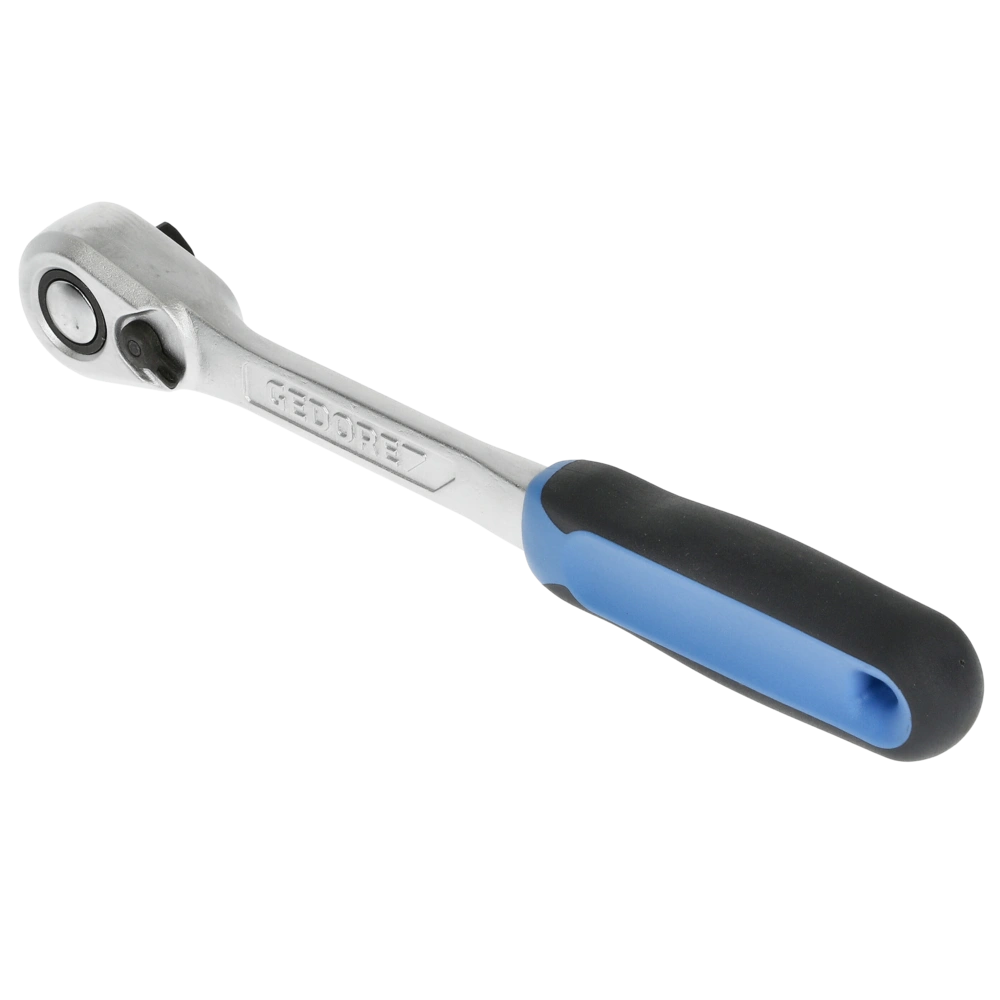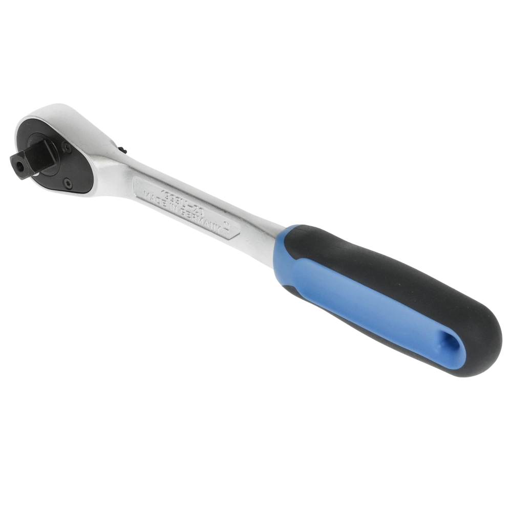 Ratchet with 1/2" square drive and a return angle of 6°. Due to fine toothing with 60 teeth, the operation in confined areas is possible. A lever change and push-button release make it easy to change the sockets and the direction of rotation.