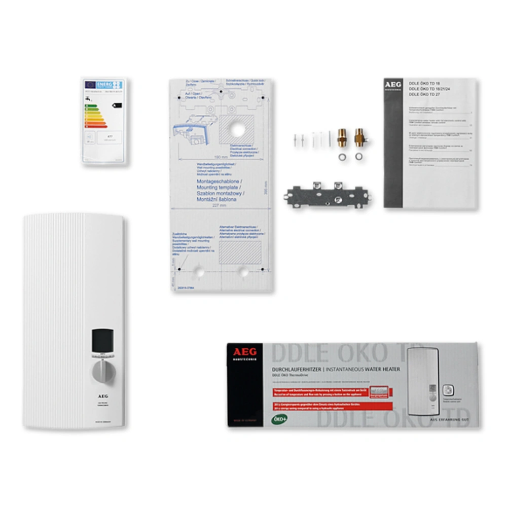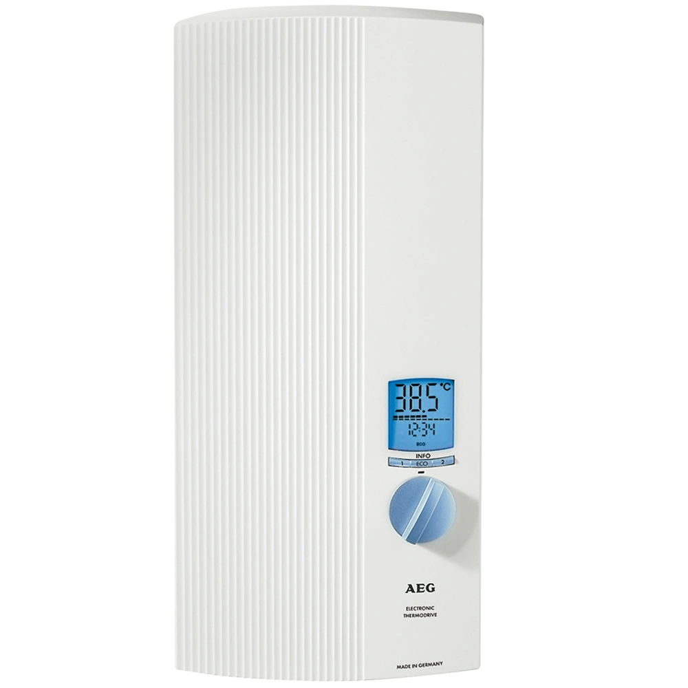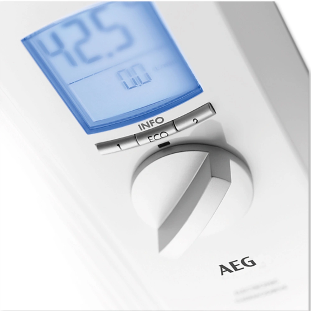 Tutte le informazioni sul prodotto FornituraLo scaldacqua è anche adatto per larghe portate d'acqua. Contiene una regolazione di portata dinamica e tiene perciò la temperatura d'acqua calda costante. Grazie ai pulsanti di accumulatore temperatura si può regolare la temperatura individualmente. Inoltre contiene un modo ECO con un indicatore di consumo per il funzionamento molto efficace e un display LS che cambia il colore da blu a rosso appena la temperatura viene impostata su i +42 °C e perciò avverte dalle scottature.