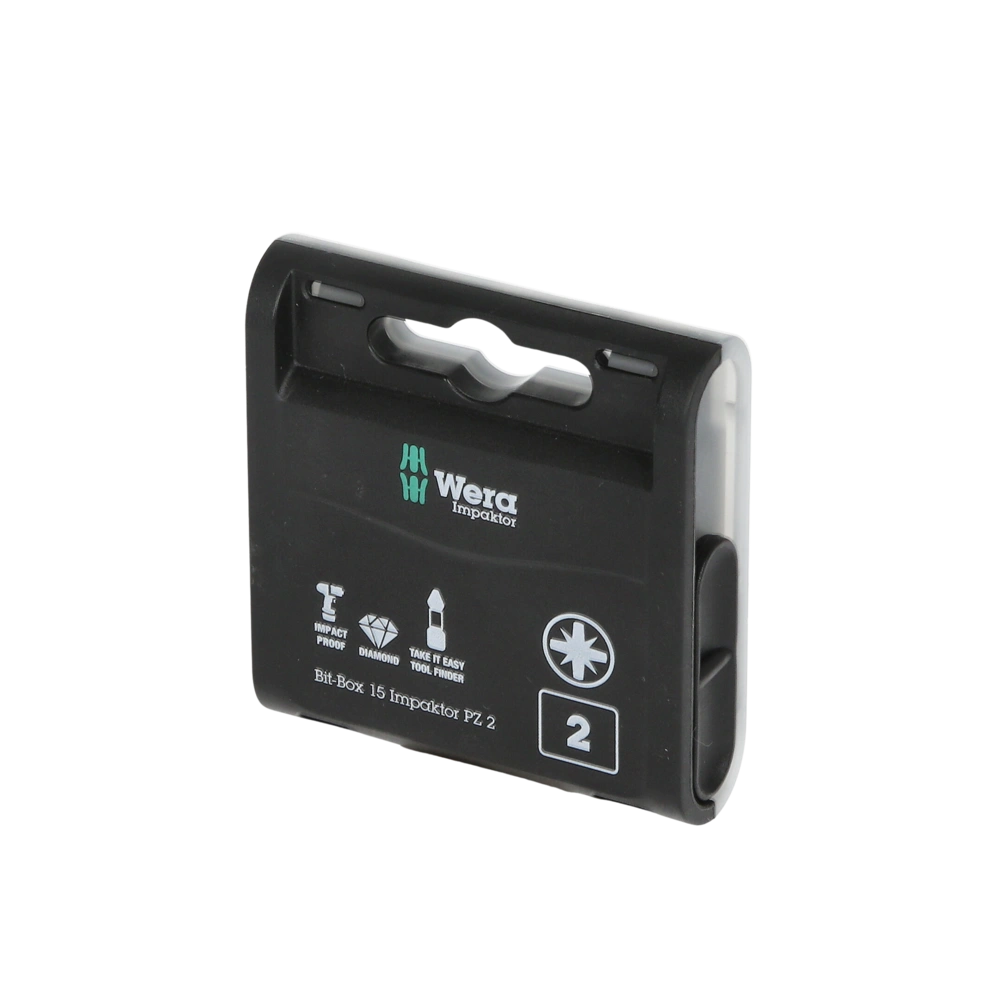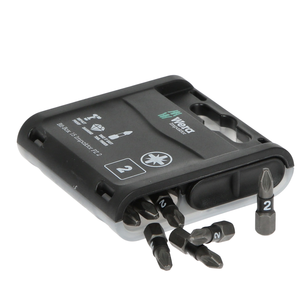 Pratico assortimento di 15 punte magnetiche PZ2 per viti con intaglio a croce in scatola portatile, per avvitatore ad impulsi e cacciavite a percussione. Le punte sono realizzate in un materiale di...