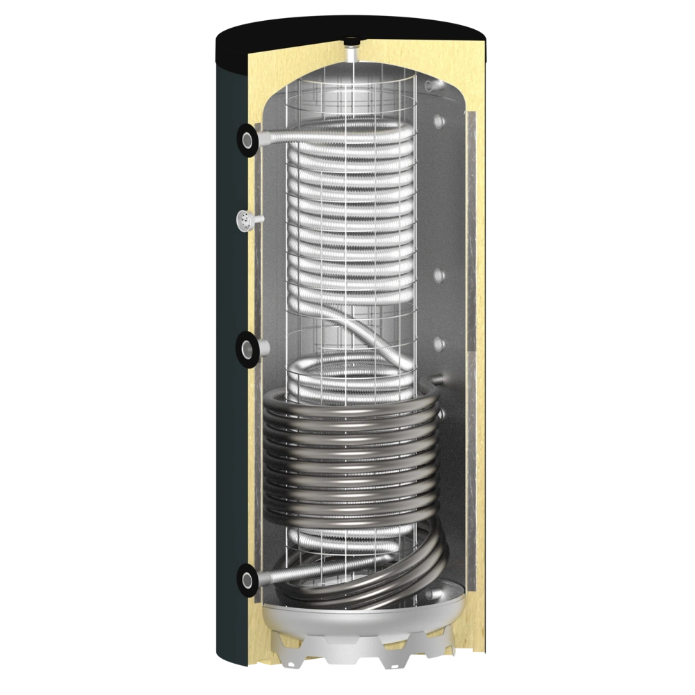 Frage zum 200l Frischwasserspeicher 516008262 mit einem Glattrohrwärmetauscher: Das Bild zeigt einen Glattwärmetauscher. In den technischen Daten auf S.16 gibt es C und E Zusatzwärmetauscher 4,2l oben und einen J und M Zusatzwärmetauscher 7,5l unten. Was ist richtig? Gibt es auch eine 90 Grad Variante vom 200l Modell?