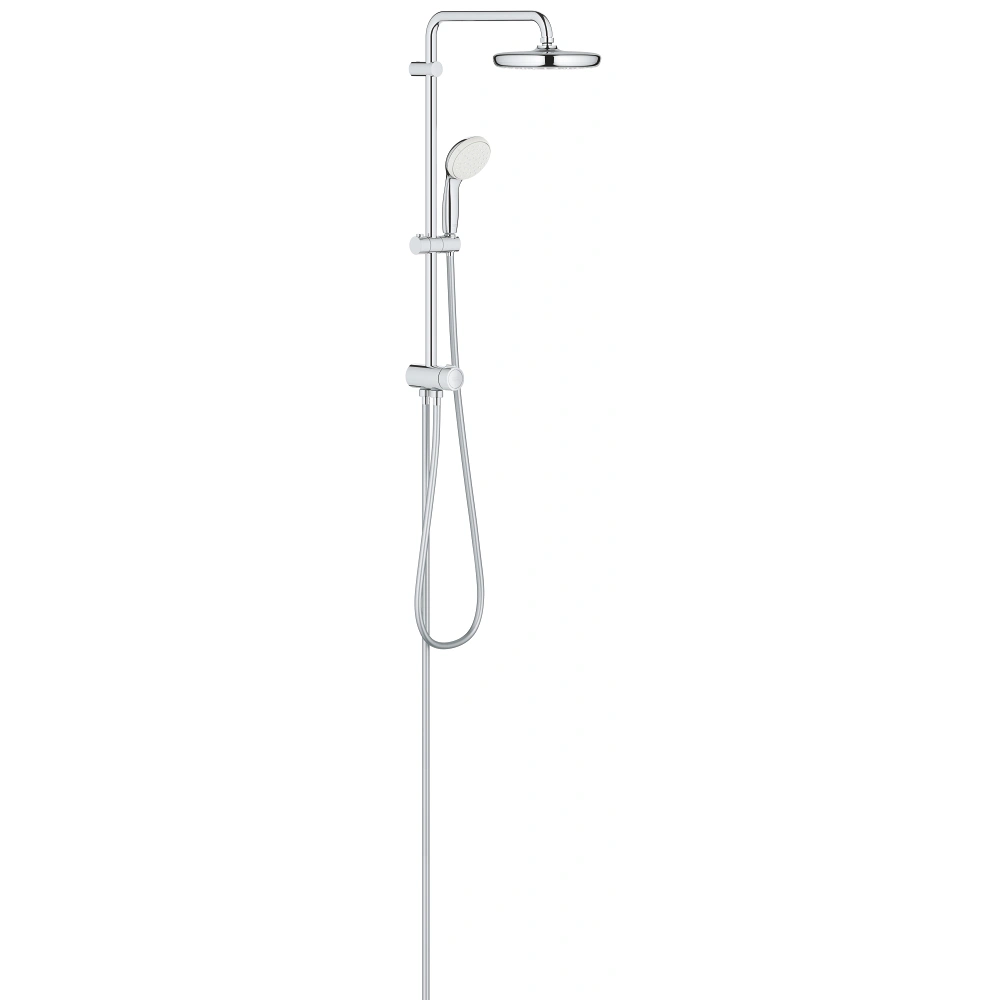 Il sistema doccia GROHE Tempesta System 210 Flex contiene un braccio doccia orizzontale che può essere allineato individualmente durante l'installazione iniziale. Il soffione, che può essere orientato fino a 15 ° su uno snodo e contiene un anello di silicone per proteggerlo dai danni in caso di caduta, offre 2 tipi di getto. La doccetta può essere regolata in altezza di 620 mm grazie all'elemento scorrevole tra il deviatore e la console superiore. Entrambi i soffioni sono dotati del sistema anticalcare, dove i depositi possono essere facilmente rimossi. L'invertitore permette di scegliere tra la doccetta e il soffione in posizione eco.