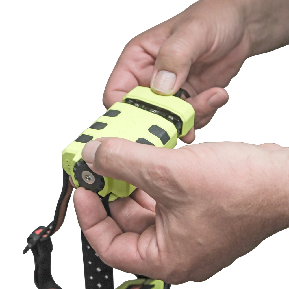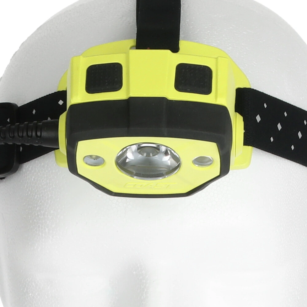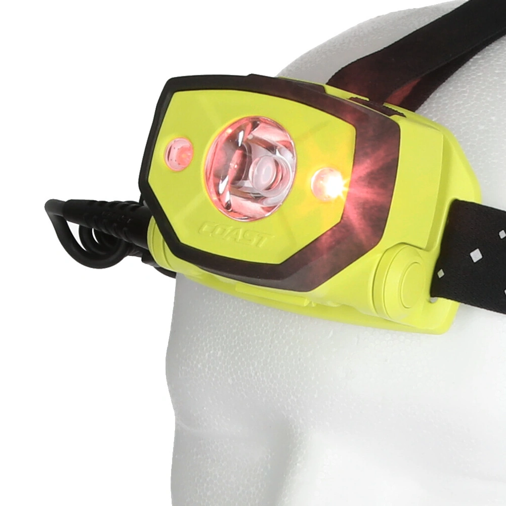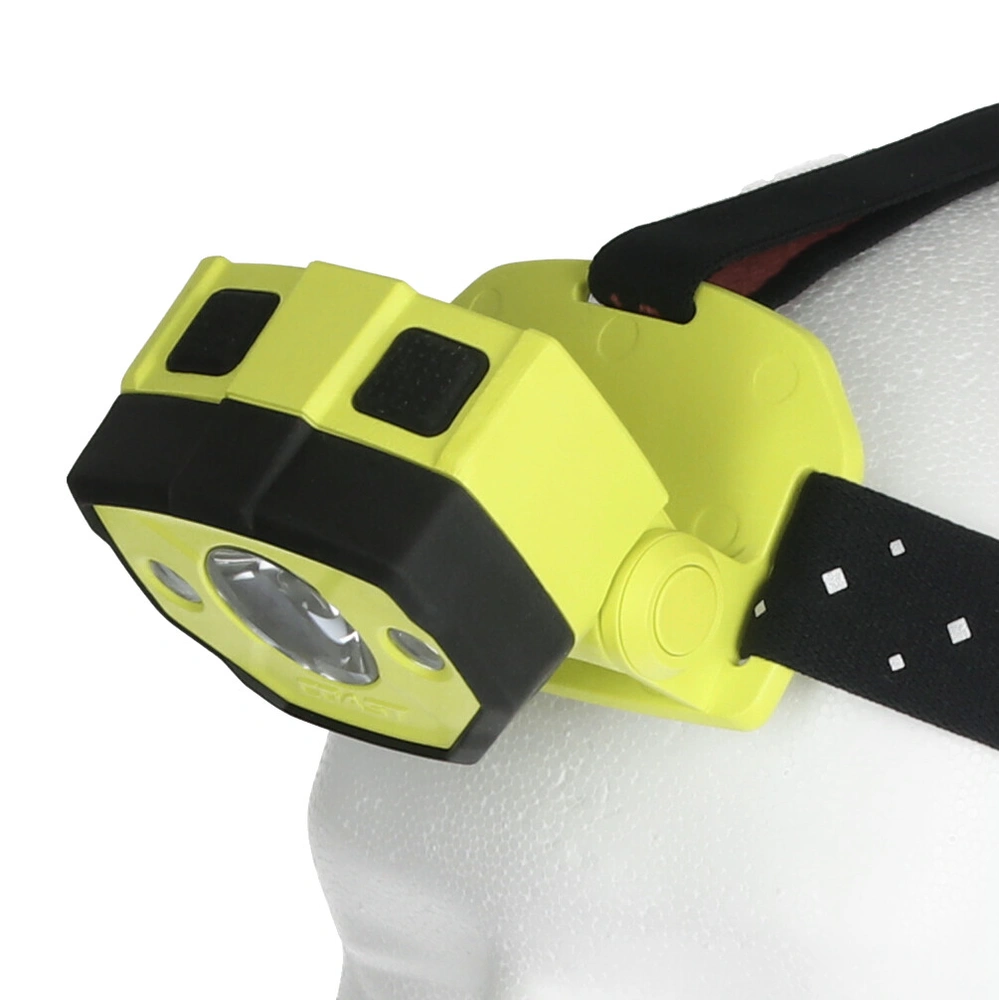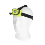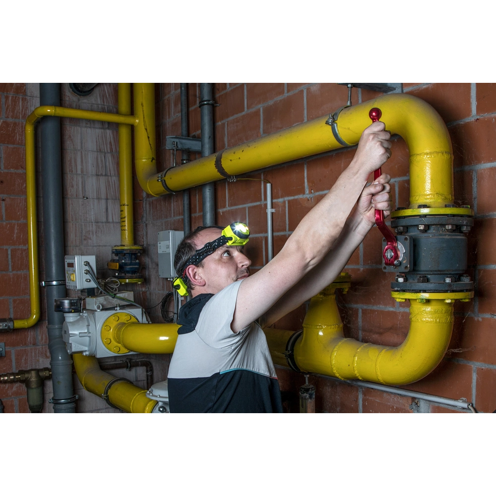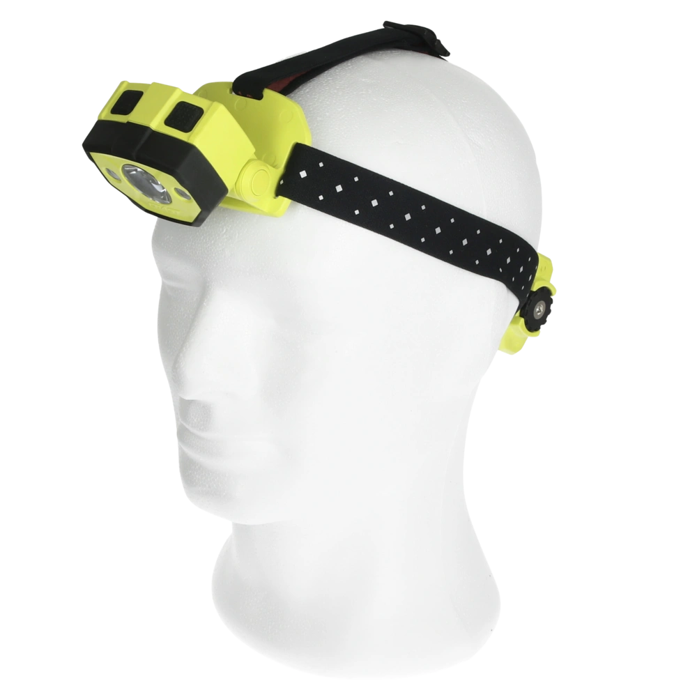 Lampada da testa a batteria, con fascio luminoso orientabile e corpo con protezione antipolvere e antischizzi per l'uso in aree potenzialmente esplosive. La focalizzazione del fascio luminoso può essere regolata in continuo da effetto Spot a illuminazione diffusa con 2 livelli di luminosità. Inoltre, la torcia frontale fornisce una luce rossa indicata per lavorare al buio. I clip a corredo consentono il fissaggio della lampada su un elmetto protettivo.