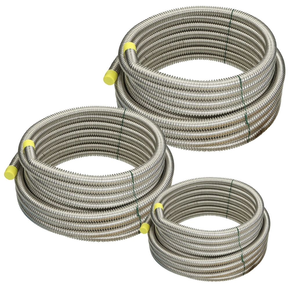 Tubo corrugato in acciaio inox V4A di alta qualità per il collegamento rapido e flessibile di pompe di calore, impianti di riscaldamento, solari e di raffreddamento. Grazie alla sua elevata flessibilità, il tubo corrugato in acciaio inox è particolarmente adatto quando l'installazione richiede raggi di curvatura ridotti. Il tubo può essere accorciato individualmente con tagliatubi in acciaio inox e può quindi essere utilizzato in vari modi nella costruzione di impianti.