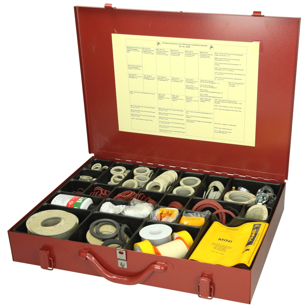 La valigetta in lamiera d'acciaio rossa contiene molti accessori e pezzi di manutenzione utili per l'installatore. Tutto è facile da prendere, ordinato e adatto per il servizio.