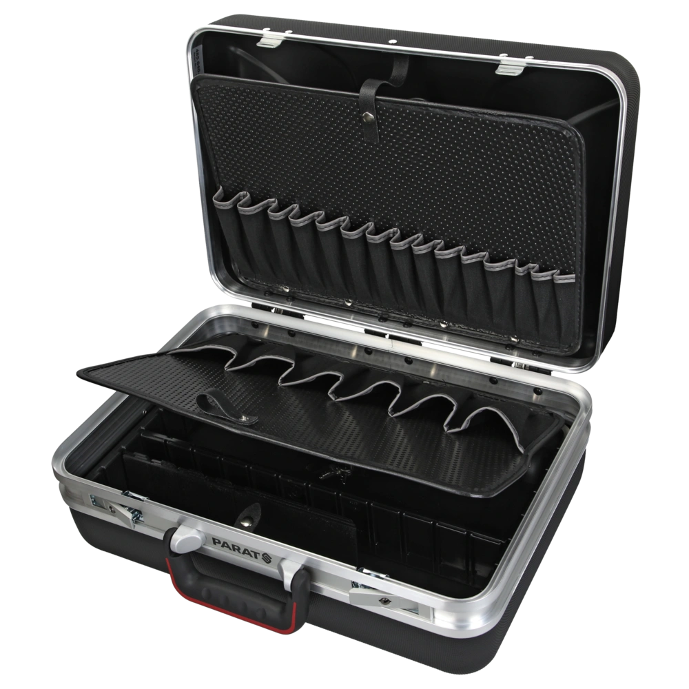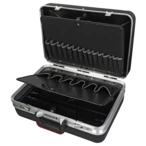 Tutte le informazioni sul prodotto FornituraQuesta robusta valigetta portautensili è caratterizzata da una disposizione interna ben studiata e pratica. Tra le robuste ciotole in plastica di alta qualità nasconde un totale di 21 tasche, un vano portadocumenti, una piastra di copertura con 6 ampie tasche e un guscio inferiore di 58 mm di altezza, liberamente suddivisibile. Inoltre, la custodia ha una robusta maniglia, una chiusura sicura e robusta con cerniere in metallo.