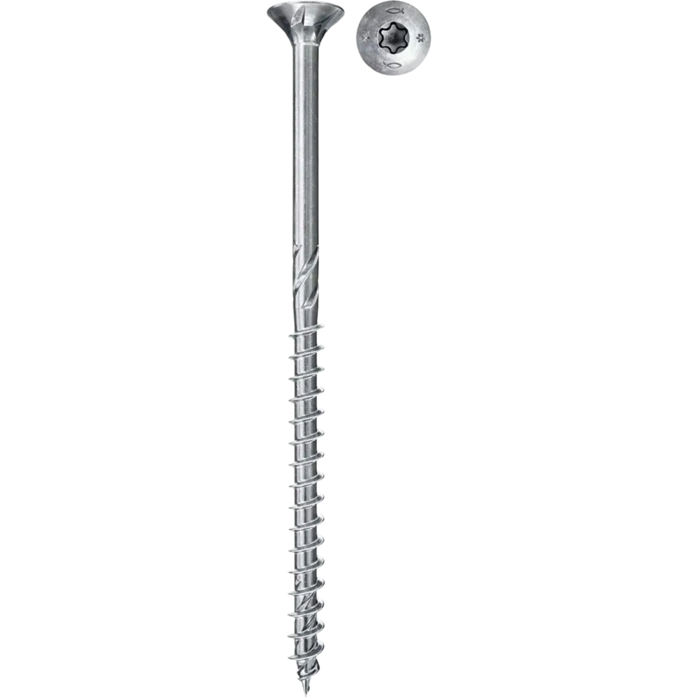 Chipboard screw with partial thread and Torx star recess and countersunk head. The partial thread enables the firm attachment of wooden elements to each other. The electrogalvanised and blue passivated screw is suitable for fixing load-bearing components in coated wood, hardwood, softwood and timber connections.