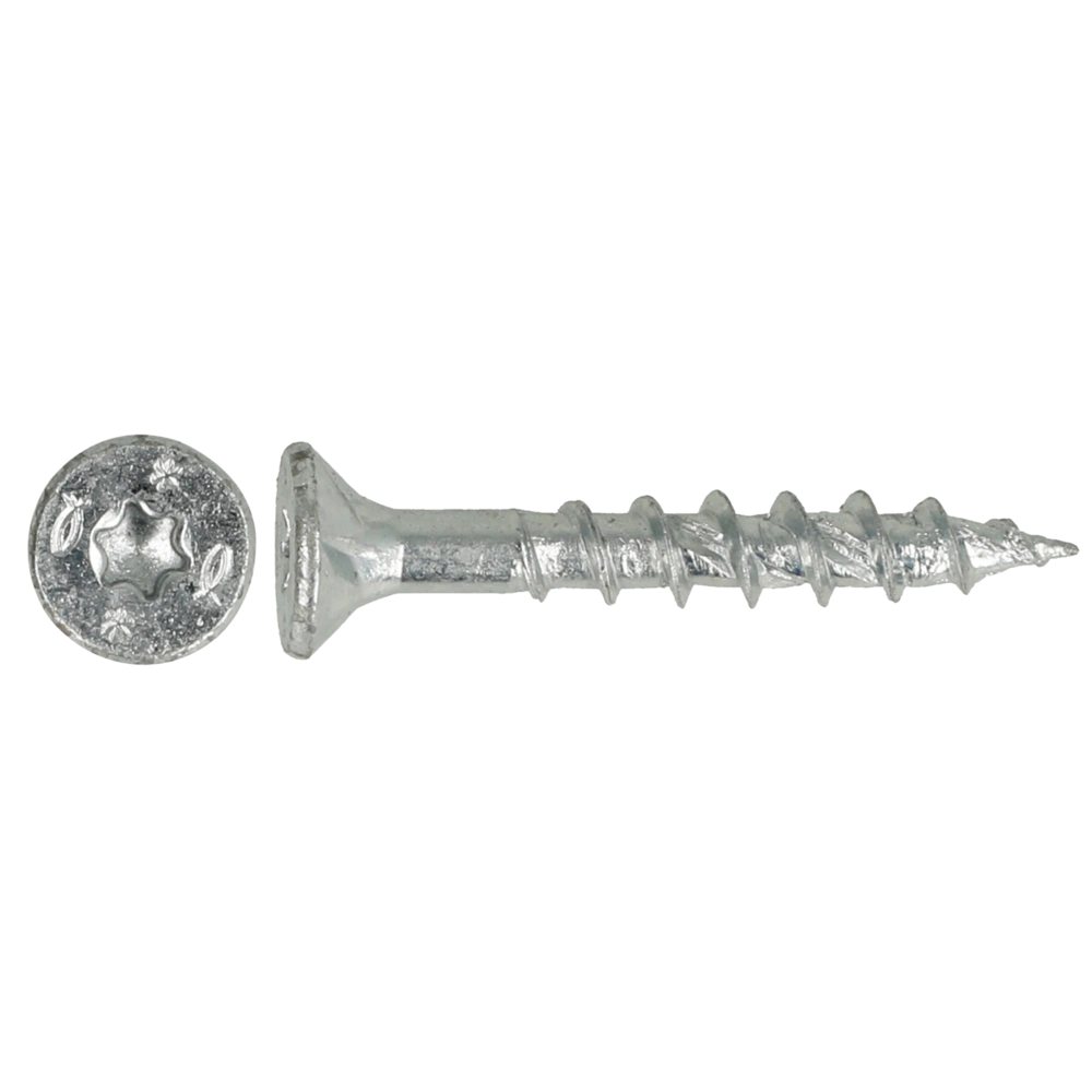 Chipboard screw with partial thread and Torx star recess and countersunk head. The partial thread enables the firm attachment of wooden elements to each other. The electrogalvanised and blue passivated screw is suitable for fixing load-bearing components in coated wood, hardwood, softwood and timber connections.
