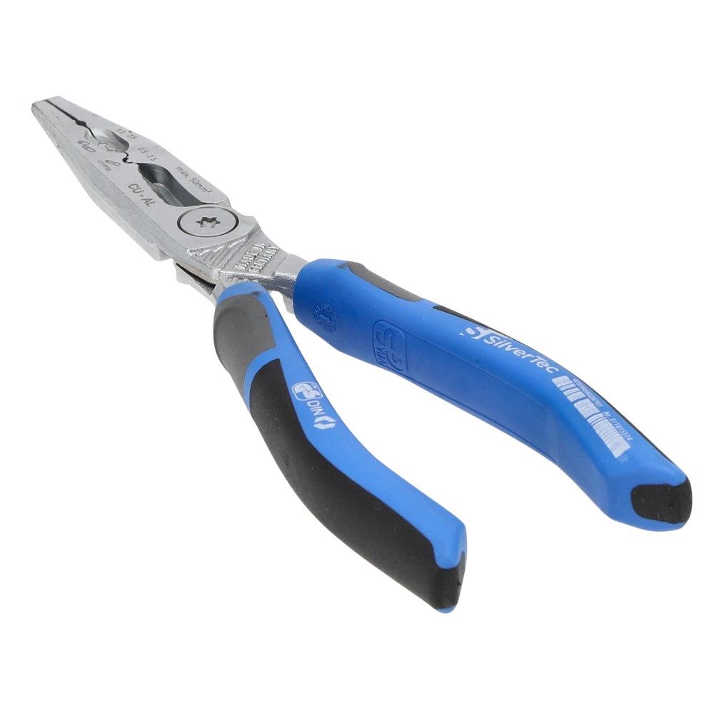 Multifunctionele tang van hoogwaardig gereedschapsstaal voor elektrische installatie. De getande grijpvlakken en de profielgroef met gladde bodem zorgen voor krachtig trekken en buigen en voor een nauwkeurige geleiding van kabels en leidingen. De tang heeft stripgaten voor flexibele en massieve geleiders van 1,5 en 2,5 mm², een krimpnest voor adereindhulzen van 0,5 tot 2,5 mm² en knipt koper- en aluminiumkabels tot 5 x 1,5 mm² knelvrij door. De scherpe punt kan ook worden gebruikt voor het doorboren en ontbramen van inbouwdozen. De stroeve 2-componenten handgreep garandeert comfortabel en veilig werken.