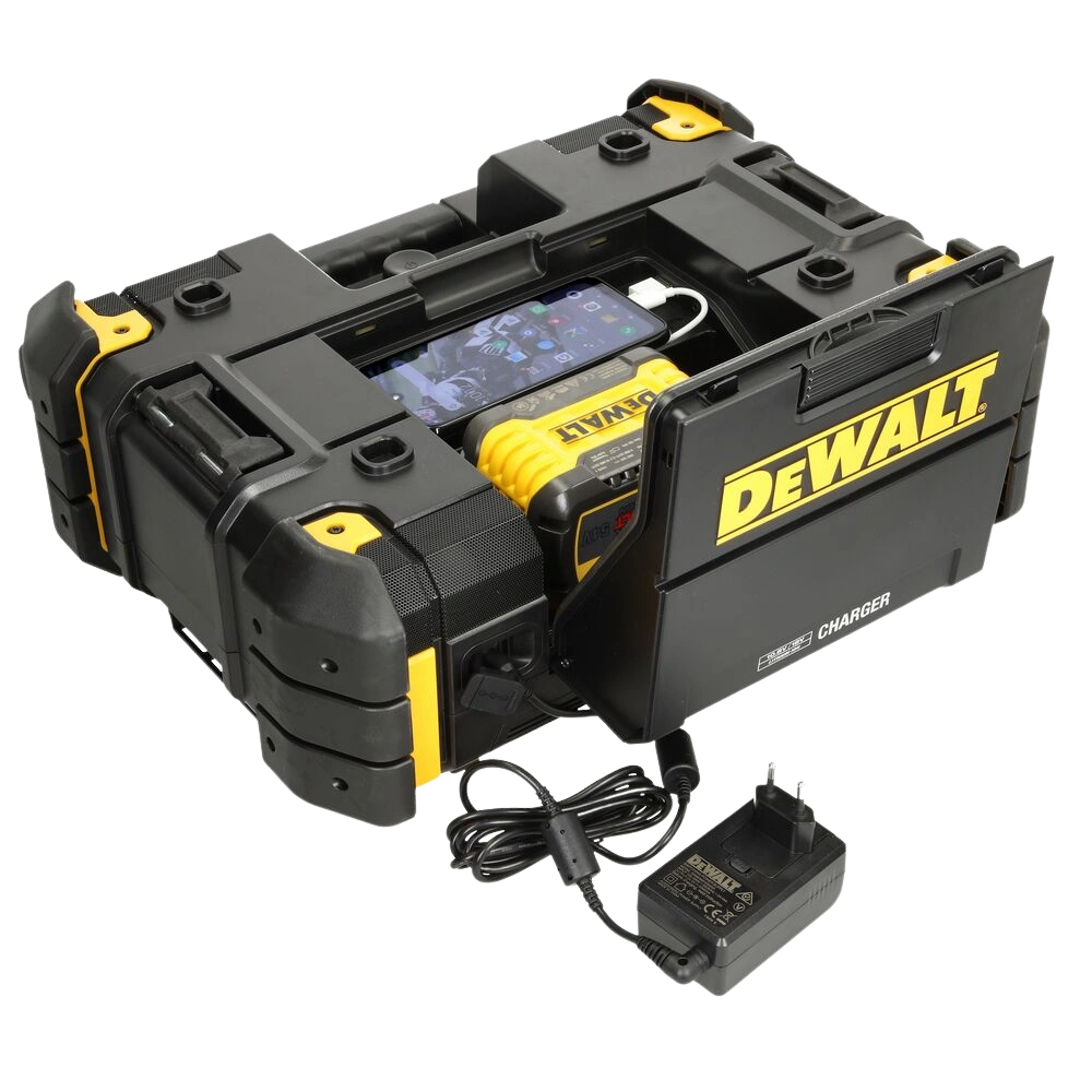 De radio kan worden gebruikt met alle DeWALT-batterijen, inclusief FLEXVOLT, maar ook via voeding en dient ook als laadstation voor alle 10.8 tot 54V XR-accu's.