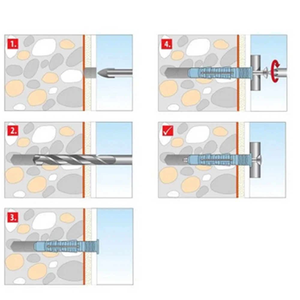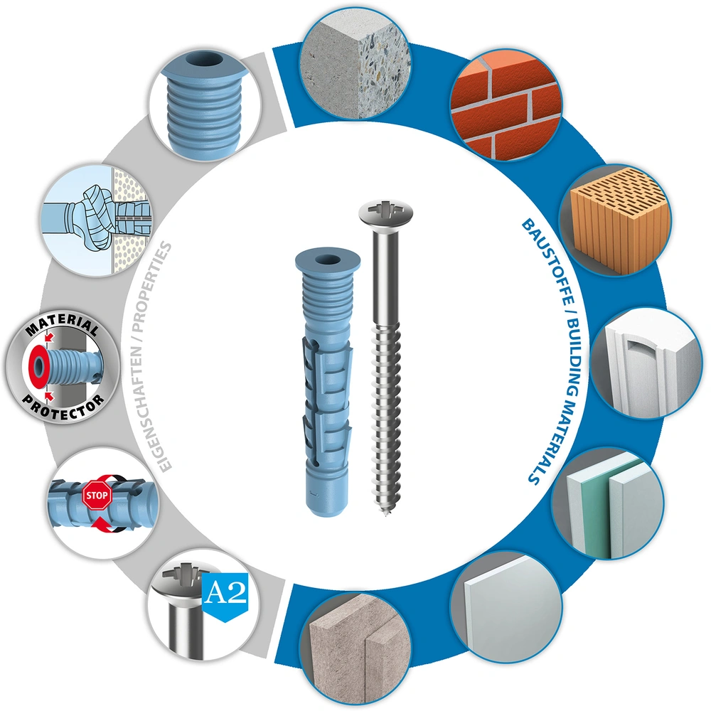 Afdichtende universele plug voor het bevestigen van objecten aan wanden of vloeren in natte ruimtes. De dubbele afdichtingslippen zorgen voor een optimale afdichting tussen de plug en het bouwmateriaal zonder gebruik van siliconen. De kraag op de plug beschermt de tegel tijdens de installatie en kan eenvoudig worden verwijderd voor vlakke installaties, terwijl de wigvormige vergrendeling voorkomt dat de plug in het boorgat draait.