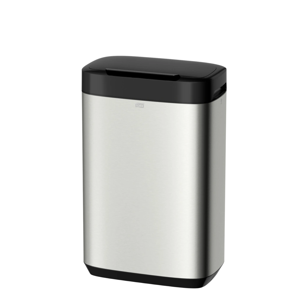 Hoogwaardige afvalbak van geborsteld RVS voor wandmontage. De slanke container heeft een zacht sluitende kunststof deksel. Het roestvrijstalen oppervlak is uitgerust met vingerafdrukbescherming voor...
