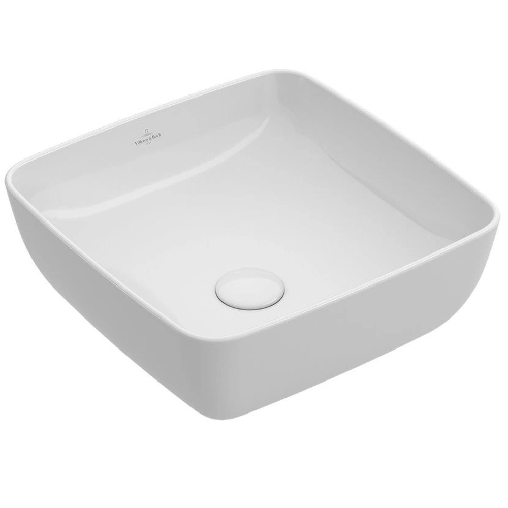 Vierkante opzetwastafel van TitanCeram voor combinatie met een wandmengkraan of een mengkraan met een verhoogde sokkel. De CeramicPlus coating maakt hem gemakkelijk schoon te maken en te onderhouden.