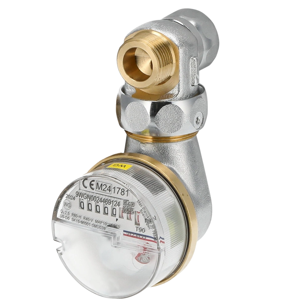 Gekalibreerde koud- en warmwatermeter voor montage tussen de S-aansluiting en mengkraan op badkuipen, douches en drukspoelers.
