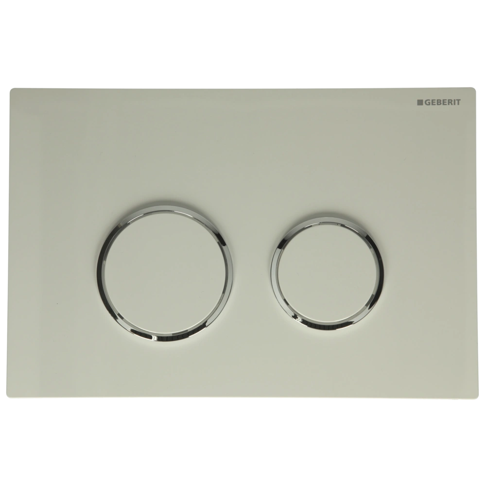 Witte bedieningsplaat Sigma20 voor dubbele spoeling met twee ronde, witte drukknoppen, die worden afgezet met een hoogglans verchroomde ring. Hij is uitgerust met een sleuf voor invoeren van reinigingsblokken...