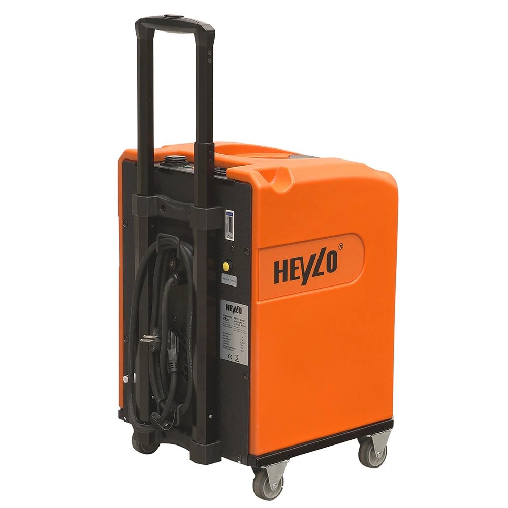De behuizing is gemaakt van uiterst solide en robuust kunststof. Dankzij de tele-scopische handgreep en de wielen die onder het apparaat zijn gemonteerd, is het apparaat zeer mobiel.