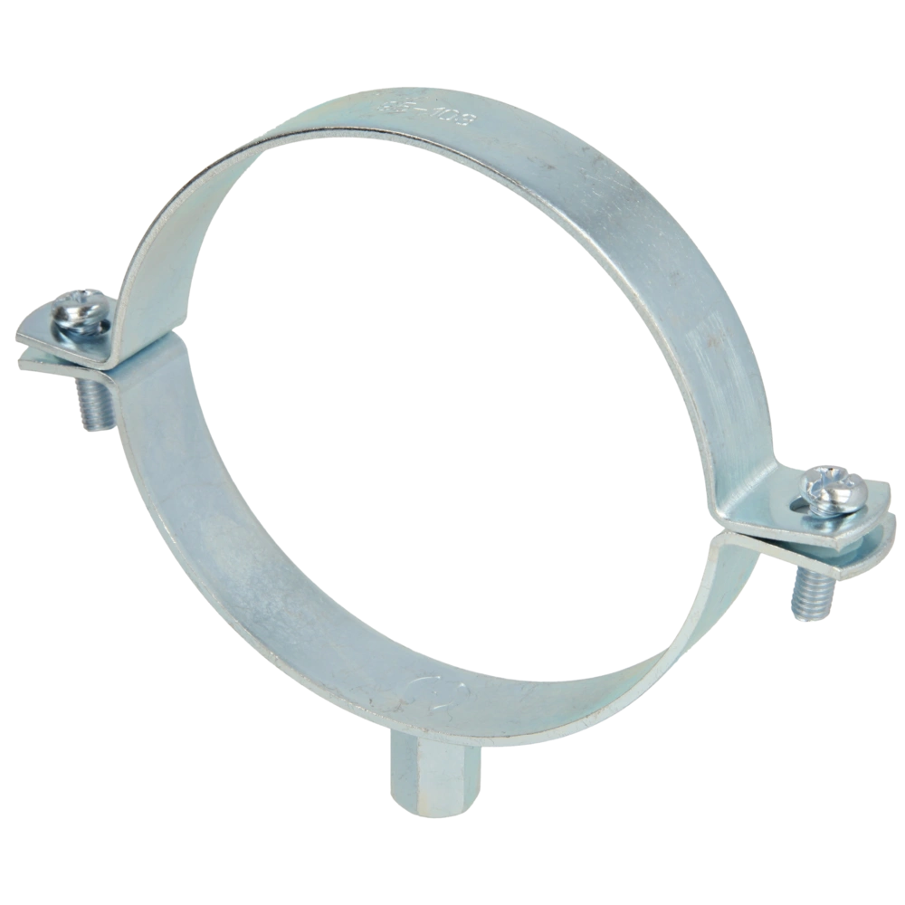Buisklemschroef voor het bevestigen van buizen aan wanden, plafonds en vloeren. De schroefklem is tweedelig en heeft een metrische schroefdraad