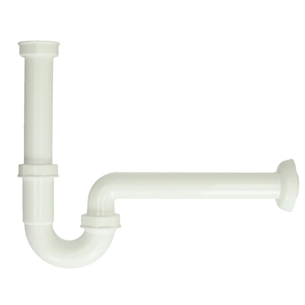 Buissifon van kunststof voor spoelbakken met een aansluiting van 1 1/4". De muuraansluiting heeft een diameter van 32 mm.