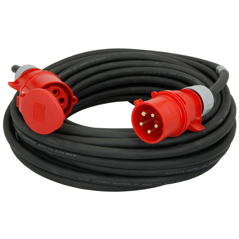 Robuuste stroomverlengkabel voor zwaar gebruik met 5-polige stekker en koppeling met scharnierend deksel voor gebruik op bouwterreinen, in de industrie en het bedrijfsleven. De rubberen kabel is beschermd...