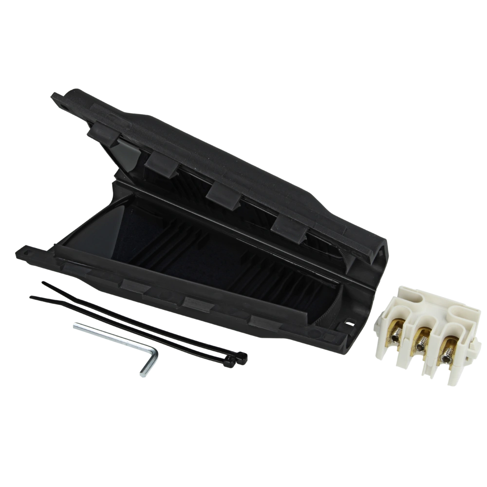 Mof met volledige gelafdichting en aftakblok met doorsnede voor het aansluiten van alle gangbare kunststofkabels met 3 tot 5 geleiders. De vlamvertragende en UV-bestendige gegoten mantel is gemaakt van hoogwaardig en slagvast kunststof. De gelmof kan binnen en buiten worden gebruikt, ook in aarde en water, en kan snel en eenvoudig worden geïnstalleerd.