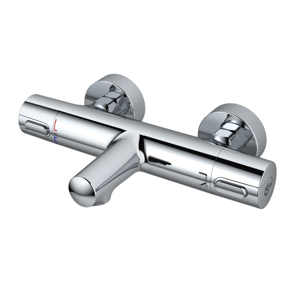 Opbouw badthermostaat met terugstroombeveiliging, Cool Body behuizing, interne beluchter en verborgen, geluidgedempte S-aansluitingen. De thermostaat heeft een duurzaam FirmaFlow thermostatisch kardoes...