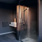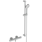 Doucheset met opbouw douchethermostaat heeft een terugstroombeveiliger, een CoolBody-behuizing en verborgen, geluidgedempte S-aansluitingen. Daarnaast wordt een FirmaFlow thermostaatpatroon met wasexpansie-element...