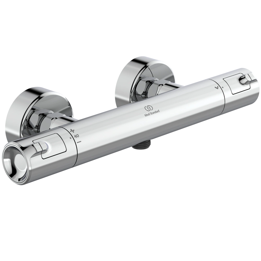 Opbouw douchethermostaat met terugslagklep, CoolBody behuizing en verborgen, geluidgedempte S-aansluitingen. De thermostaat heeft een duurzaam FirmaFlow thermostaatpatroon met keramische afdichtschijven en waselement...