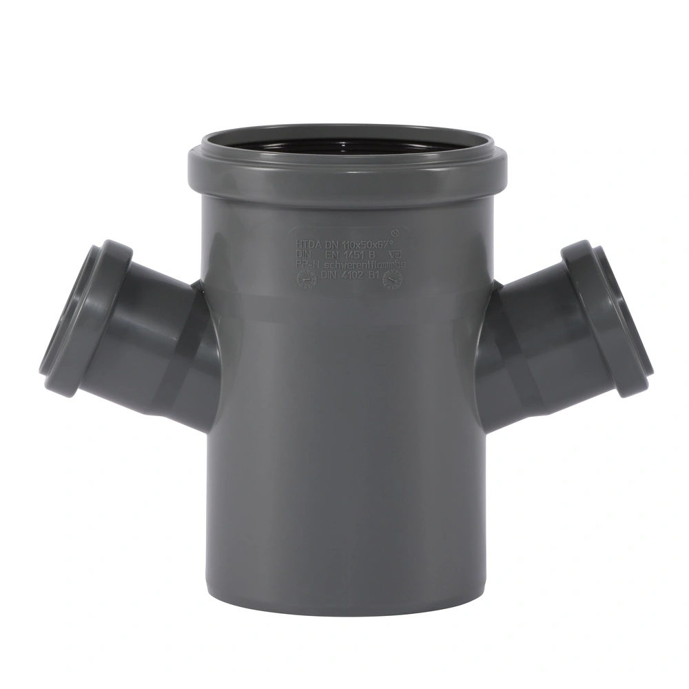 HT dubbele aftakking van moeilijk ontvlambaar PP-H volgens DIN 4102 (B1) met drie steekmoffen en drievoudige afdichtlippen voor afvalwaterleidingen binnen gebouwen volgens DIN EN 1451. De aftakking is geschikt voor warm, koud en agressief afvalwater evenals voor centrale stofzuigersystemen.