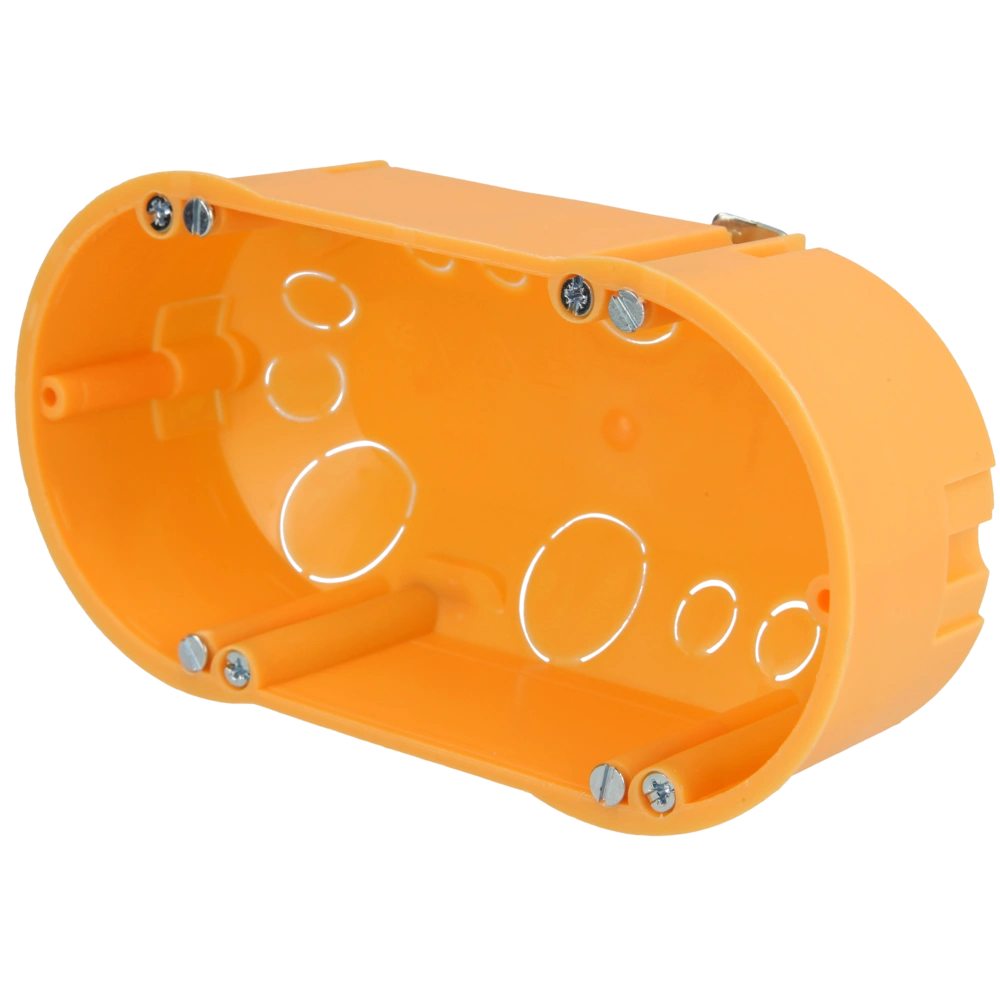 Het bewezen ontwerp met metalen klauwen en voorgemonteerde apparaatschroeven voor kosteneffectieve installatie in gipsplaat en spouwmuren. De spouwmuurdoos heeft uitsparingen voor leidingen en buizen.