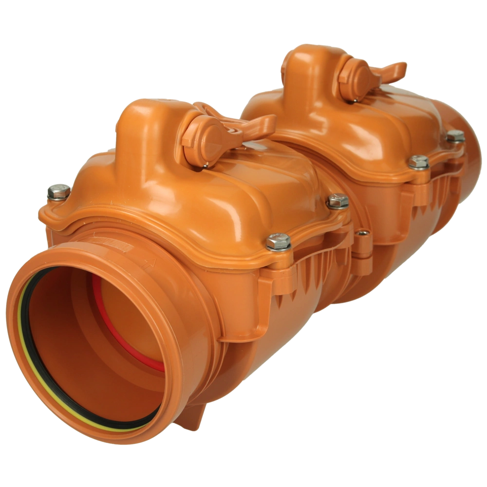 Dubbele terugslagklep voor horizontale montage in leidingen voor fecaliënvrij afvalwater. De sluiting is voorzien van een extra handmatige vergrendeling, een ongediertebescherming en zelfsluitende kleppen. De keerkleppen en alle sluitingen zijn gemaakt van RVS.
