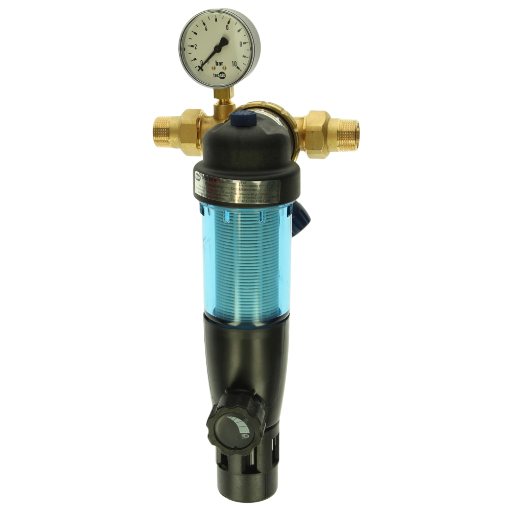 Terugspoelfilter Duo DFR voor de drinkwaterinstallatie. Eenvoudig te installeren dankzij de geïntegreerde draaibare aansluitflens. De drukregelaar beschermt de installatie tegen te hoge drukken en drukstoten. De onderhoudsindicator bovenop het filter geeft aan wanneer er onderhoud nodig is.