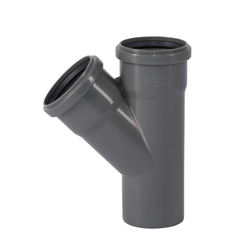 HT-enkele aftakking van moeilijk ontvlambaar PP-H volgens DIN 4102 (B1) met twee steekmoffen en drievoudige afdichtlippen voor afvalwaterleidingen binnen gebouwen volgens DIN EN 1451. De aftakking is geschikt voor warm, koud en agressief afvalwater evenals voor centrale stofzuigersystemen.