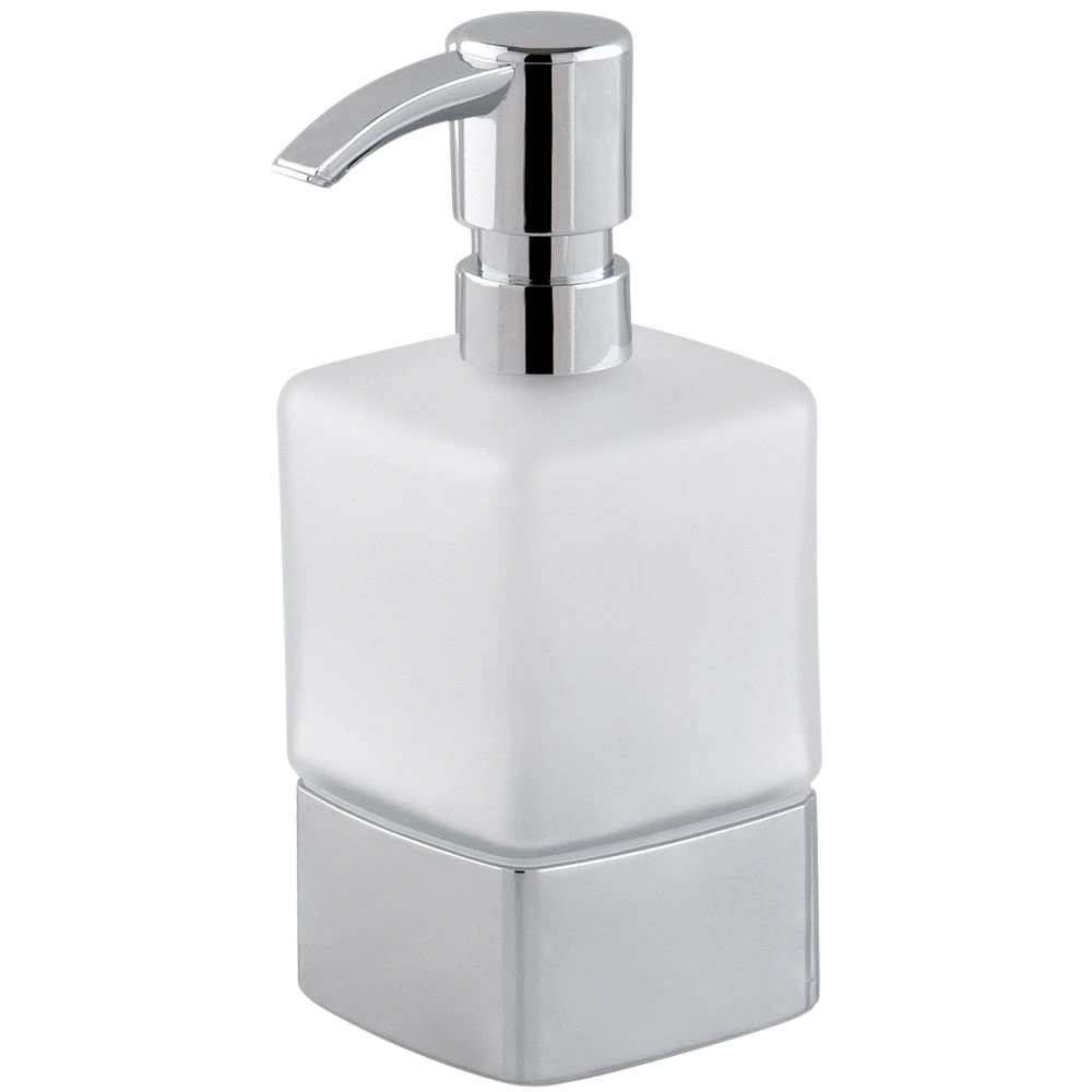 Alle productinformatieVerchroomde zeepdispenserhouder als staand model met gesatineerd kristallen glazen flesje.