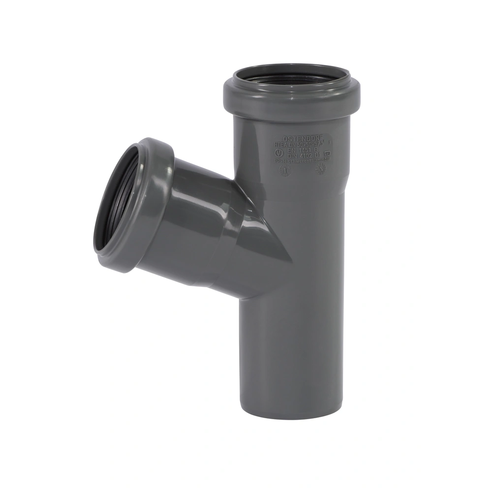 HT-enkele aftakking van moeilijk ontvlambaar PP-H volgens DIN 4102 (B1) met twee steekmoffen en drievoudige afdichtlippen voor afvalwaterleidingen binnen gebouwen volgens DIN EN 1451. De aftakking is geschikt voor warm, koud en agressief afvalwater evenals voor centrale stofzuigersystemen.
