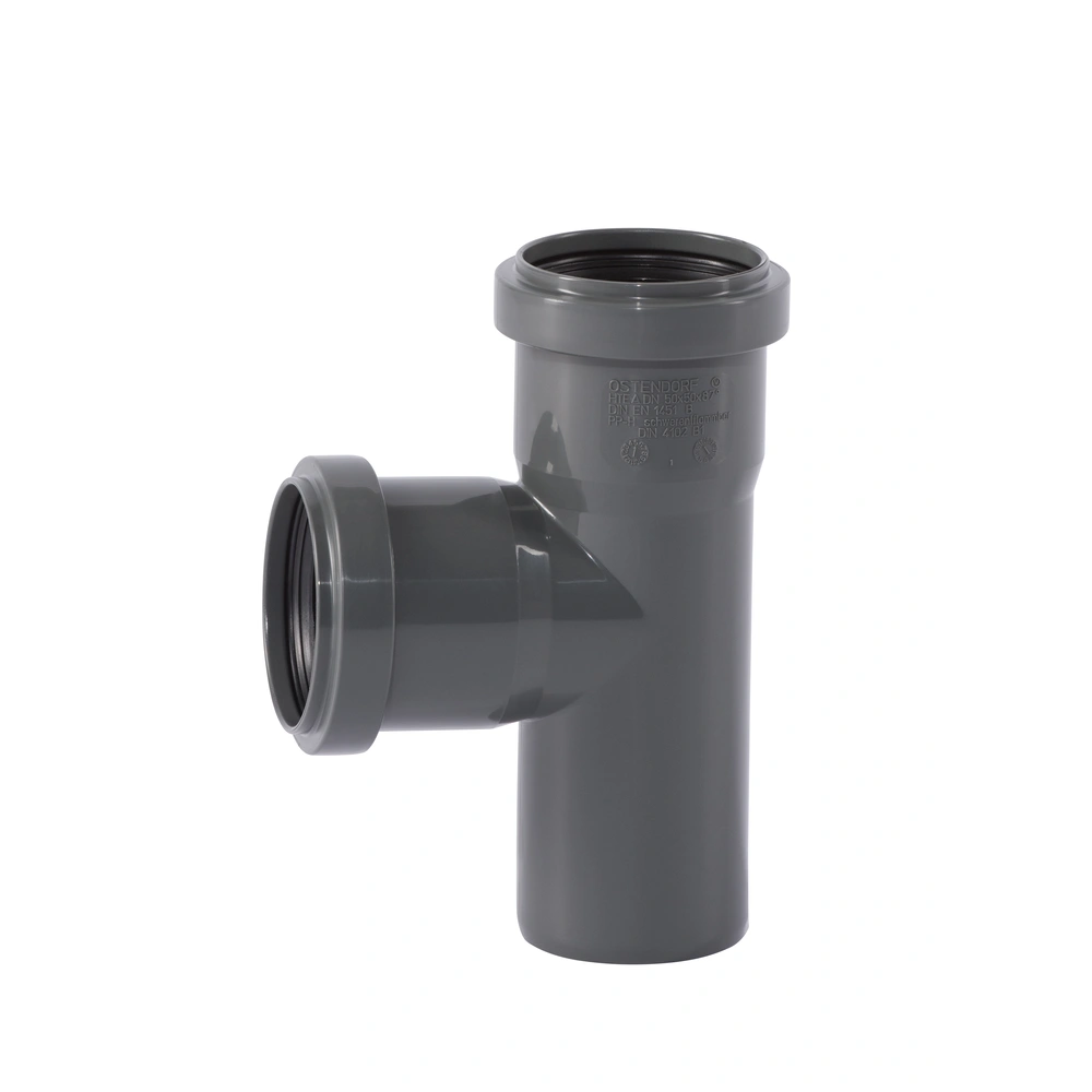HT-enkele aftakking van moeilijk ontvlambaar PP-H volgens DIN 4102 (B1) met twee steekmoffen en drievoudige afdichtlippen voor afvalwaterleidingen binnen gebouwen volgens DIN EN 1451. De aftakking is geschikt voor warm, koud en agressief afvalwater evenals voor centrale stofzuigersystemen.