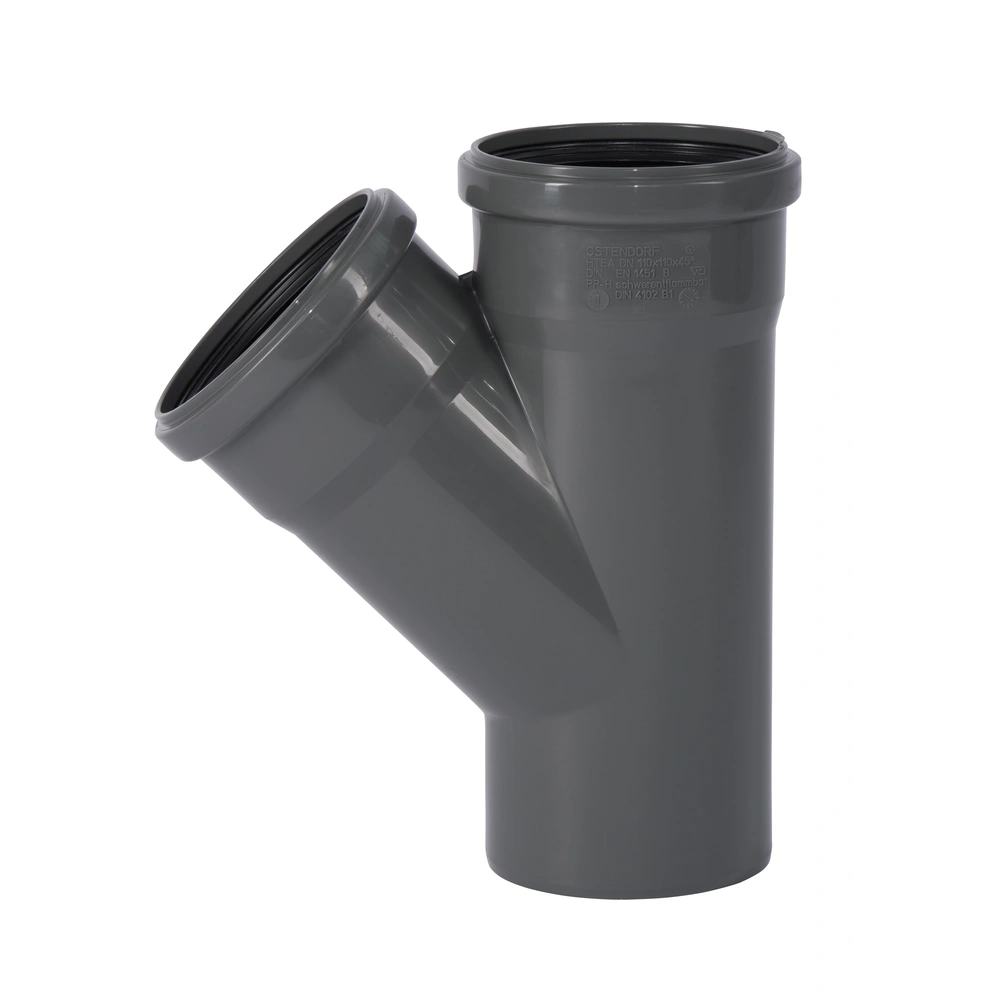HT-enkele aftakking van moeilijk ontvlambaar PP-H volgens DIN 4102 (B1) met twee steekmoffen en drievoudige afdichtlippen voor afvalwaterleidingen binnen gebouwen volgens DIN EN 1451. De aftakking is geschikt voor warm, koud en agressief afvalwater evenals voor centrale stofzuigersystemen.