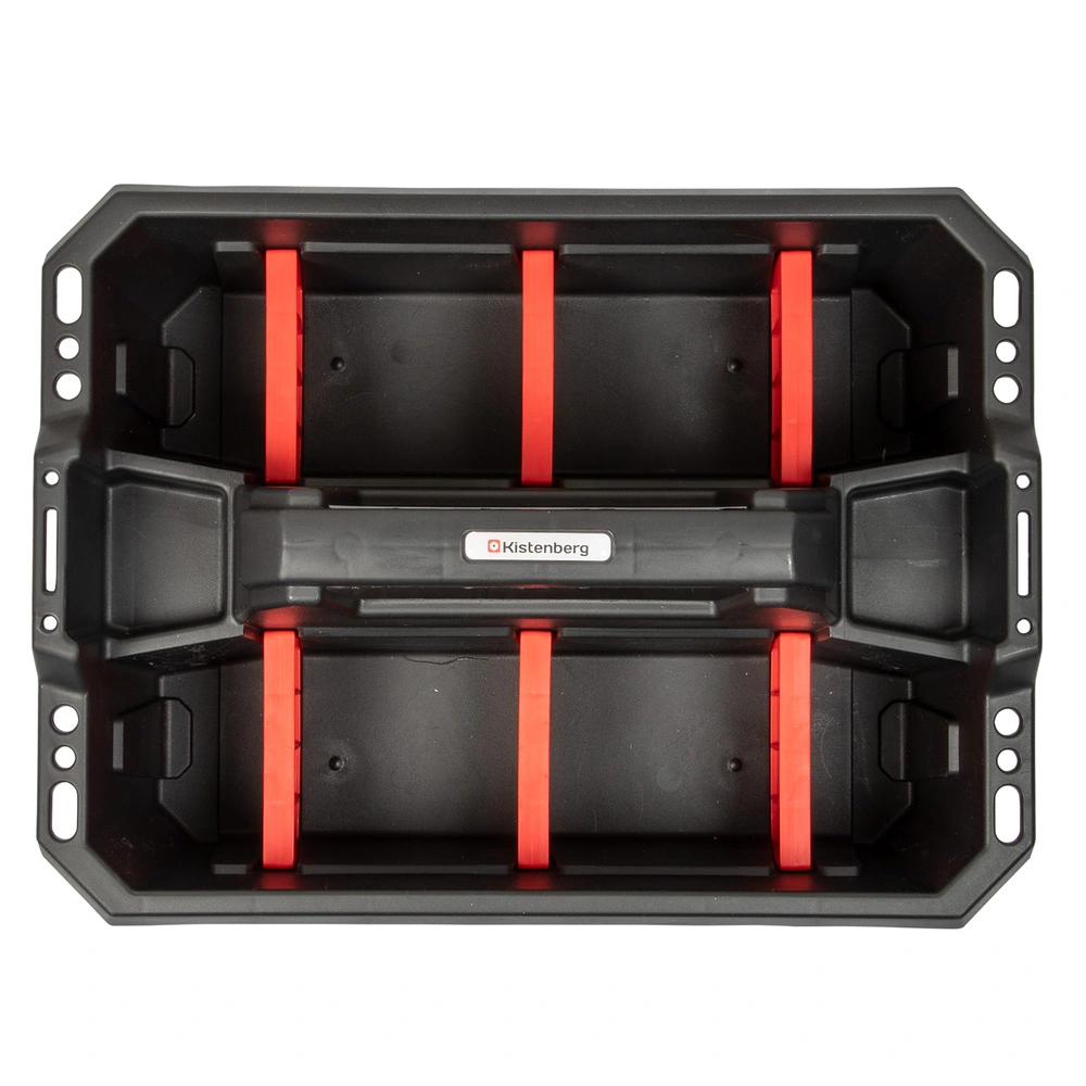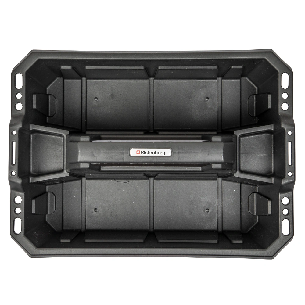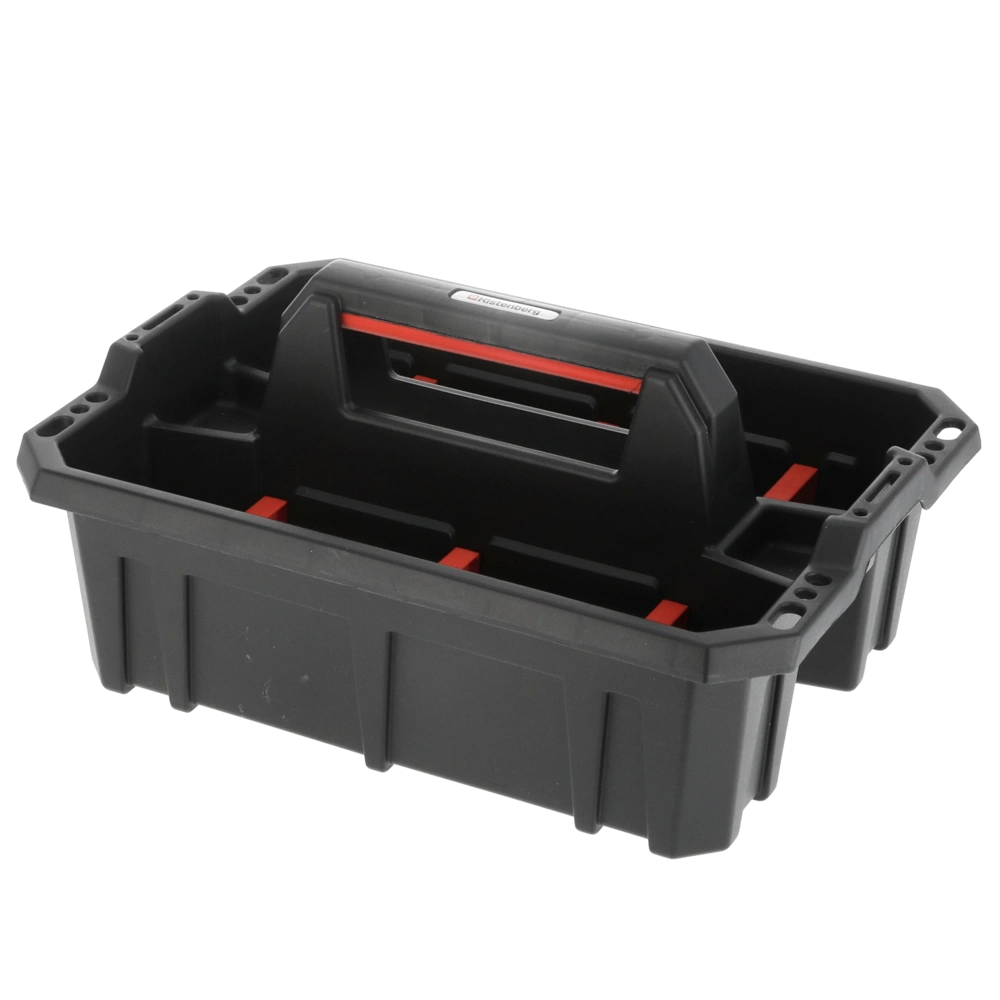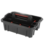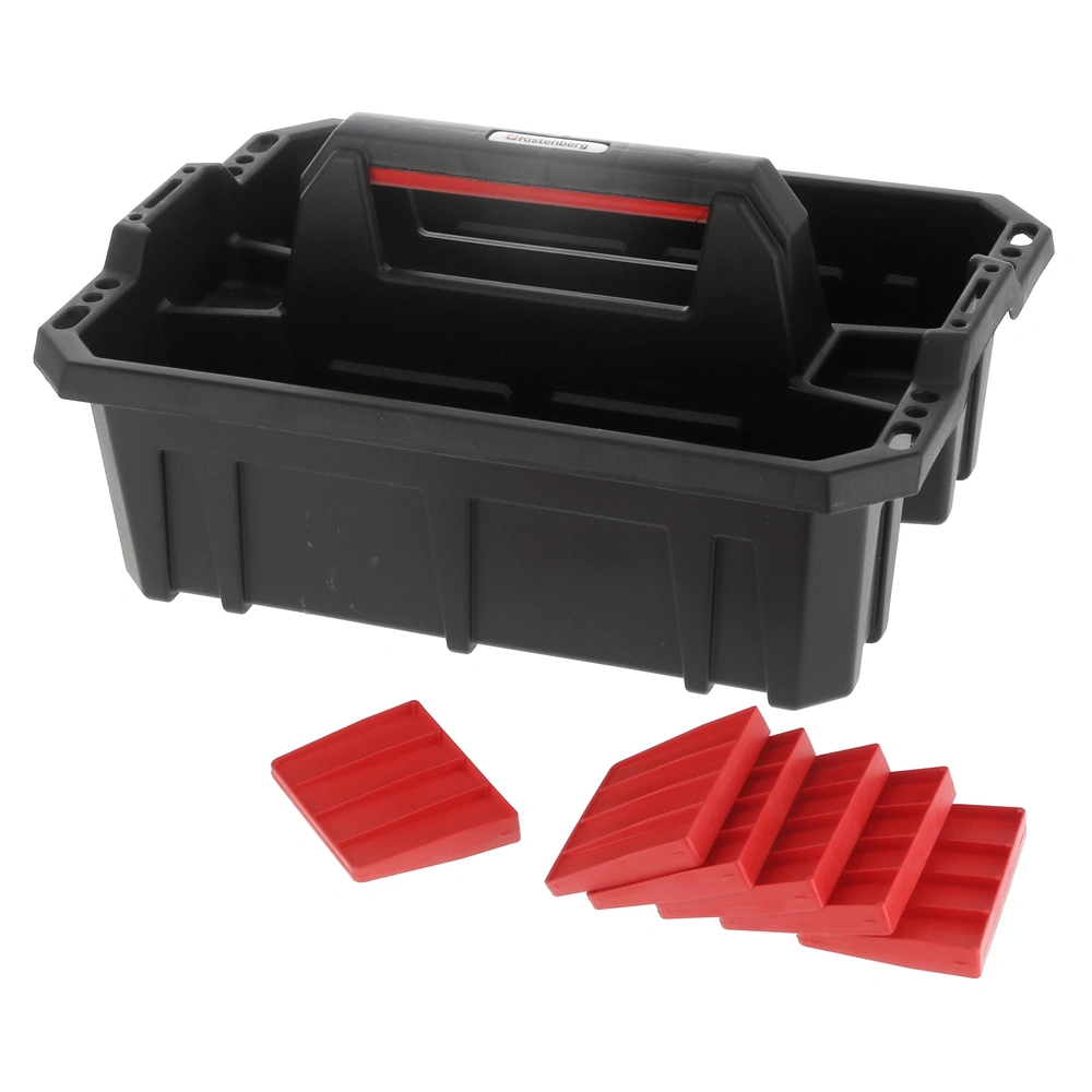 Draagbak van slijtvast kunststof voor het opbergen en vervoeren van gereedschap en kleine onderdelen. De bak heeft twee grote afzonderlijke vakken, twee opbergvakken en perforaties aan de rand om schroevendraaiers in te steken...