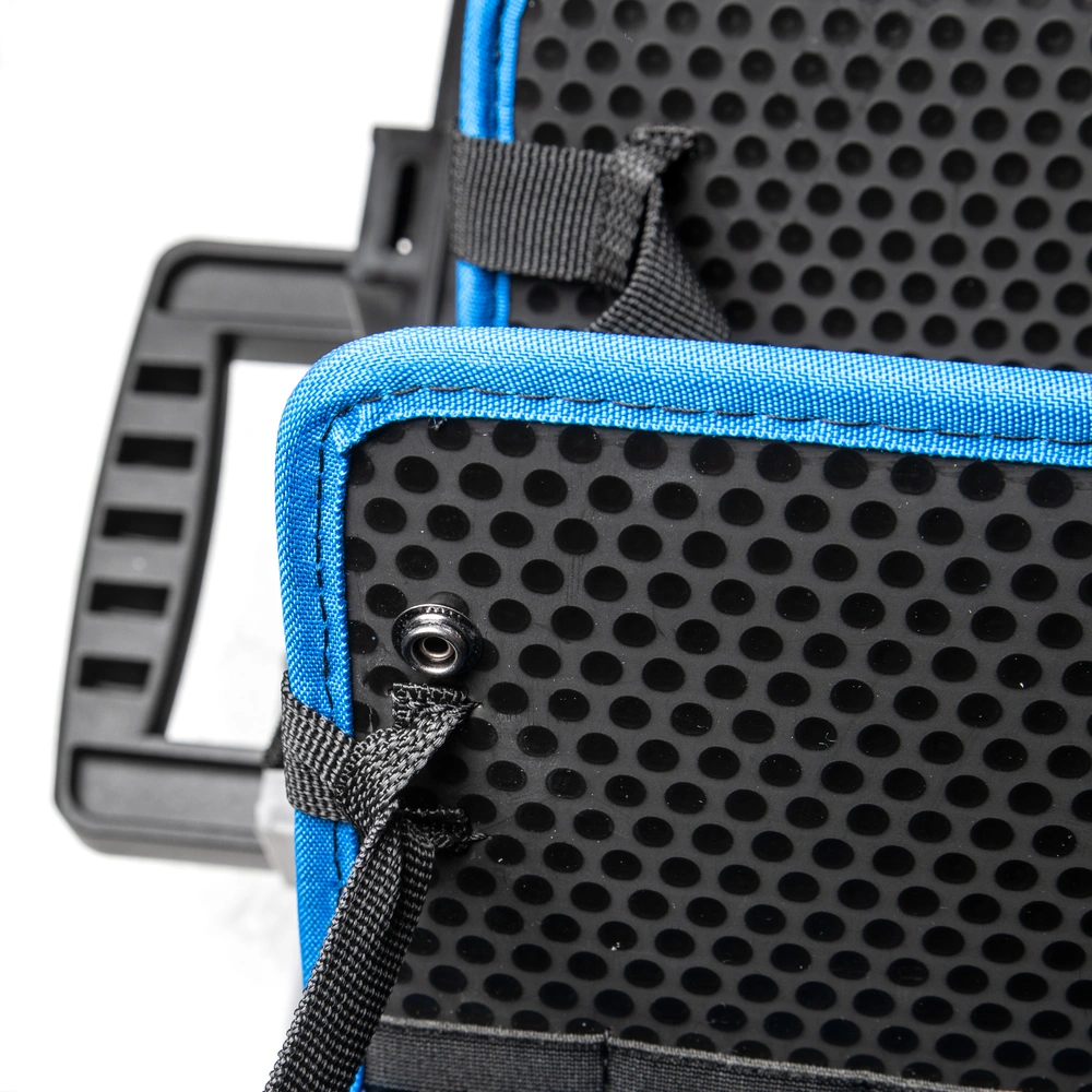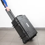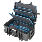 Robuuste gereedschapskoffer van polypropyleen met telescopisch handvat en twee wielen voor gemakkelijk trekken of duwen. Binnenin bevinden zich vijf gereedschapsborden met gereedschapsvakken en elastische gereedschapshouderlussen...