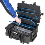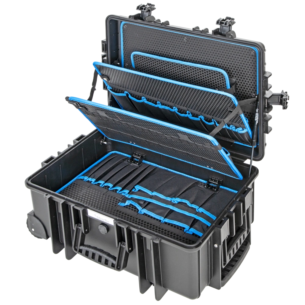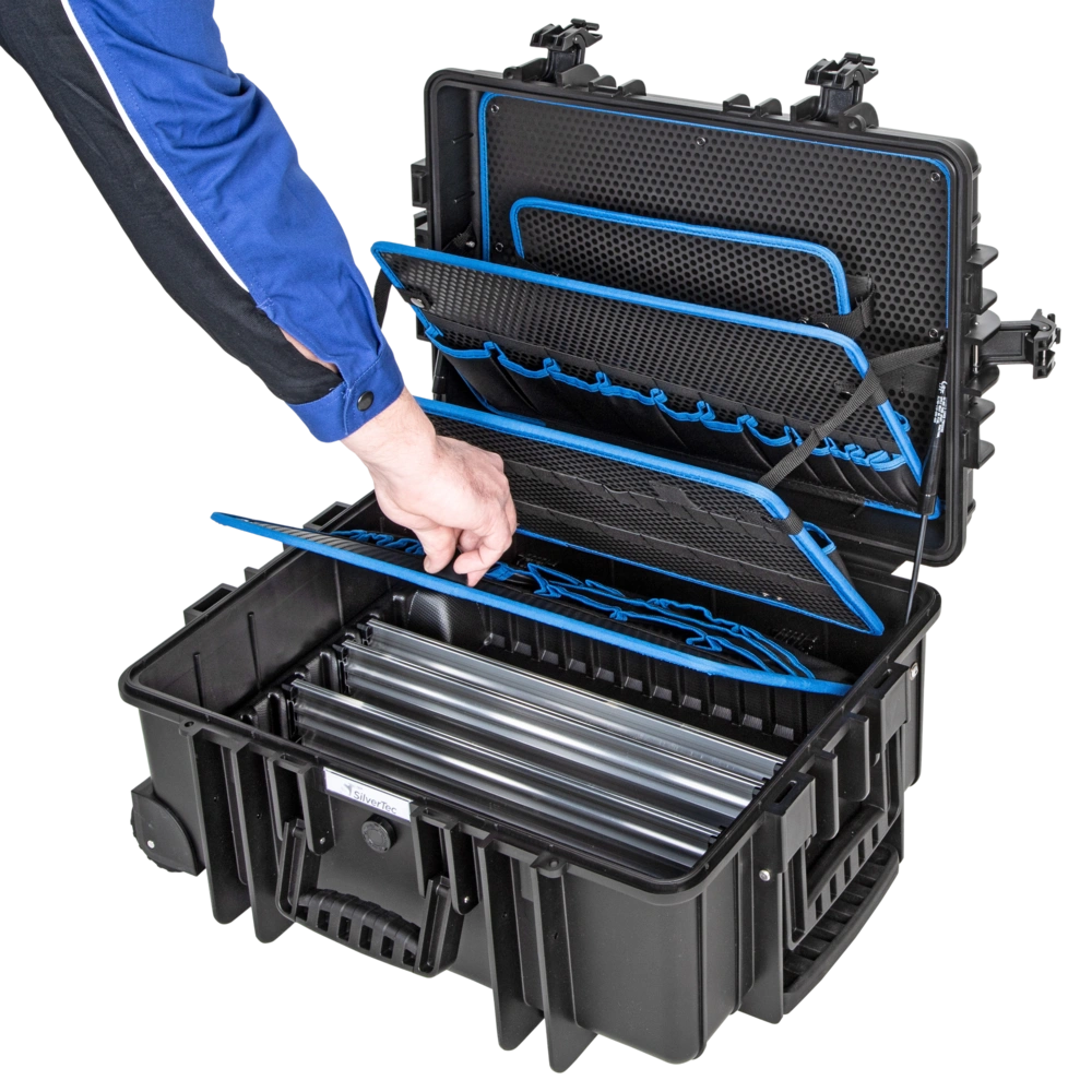 Alle productinformatieRobuuste gereedschapskoffer van polypropyleen met telescopisch handvat en twee wielen voor gemakkelijk trekken of duwen. Binnenin bevinden zich vijf gereedschapsborden met gereedschapsvakken en elastische gereedschapshouderlussen. Dankzij het aluminium scheidingssysteem kan het vloeroppervlak individueel worden onderverdeeld. Twee gasdrukveren voorkomen dat het deksel sluit. De koffer is spatwaterdicht en stofdicht.