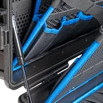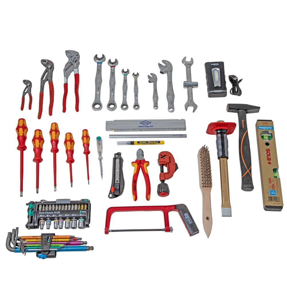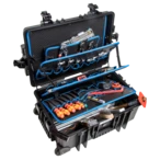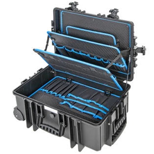 Alle productinformatie LeveringGereedschapskoffer met 27 hoogwaardige gereedschappen voor de loodgieter. Vijf gereedschapsborden met gereedschapstassen en elastische gereedschapslussen en het aluminium scheidingssysteem voor de individuele onderverdeling van het onderste gedeelte garanderen orde in de koffer. Twee gasdrukveren voorkomen dat het deksel sluit. De case is spat- en stofdicht.