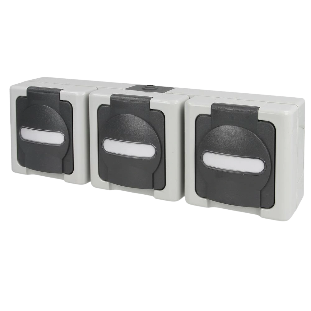De vochtbestendige drievoudige beschermende contactdoos met verlicht tekstveld heeft een enorme bedradingsruimte die van vier kanten toegankelijk is.