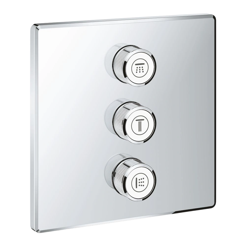 De metalen wandrozet van de drievoudige inbouwkraan, heeft een verborgen rozet- en asafdichting. De GROHE QuickFix-bevestiging kan zijdelings 6° worden uitgelijnd en ook worden verborgen. Het water wordt met één druk op de knop in- en uitgeschakeld en de hoeveelheid wordt ingesteld door te draaien. De symbolen van de knoppen zijn uitwisselbaar. Het is ook mogelijk om meerdere verbruikers tegelijkertijd gebruik te laten maken. Het GROHE StarLight-oppervlak is gemakkelijk te reinigen en ongevoelig voor krassen.