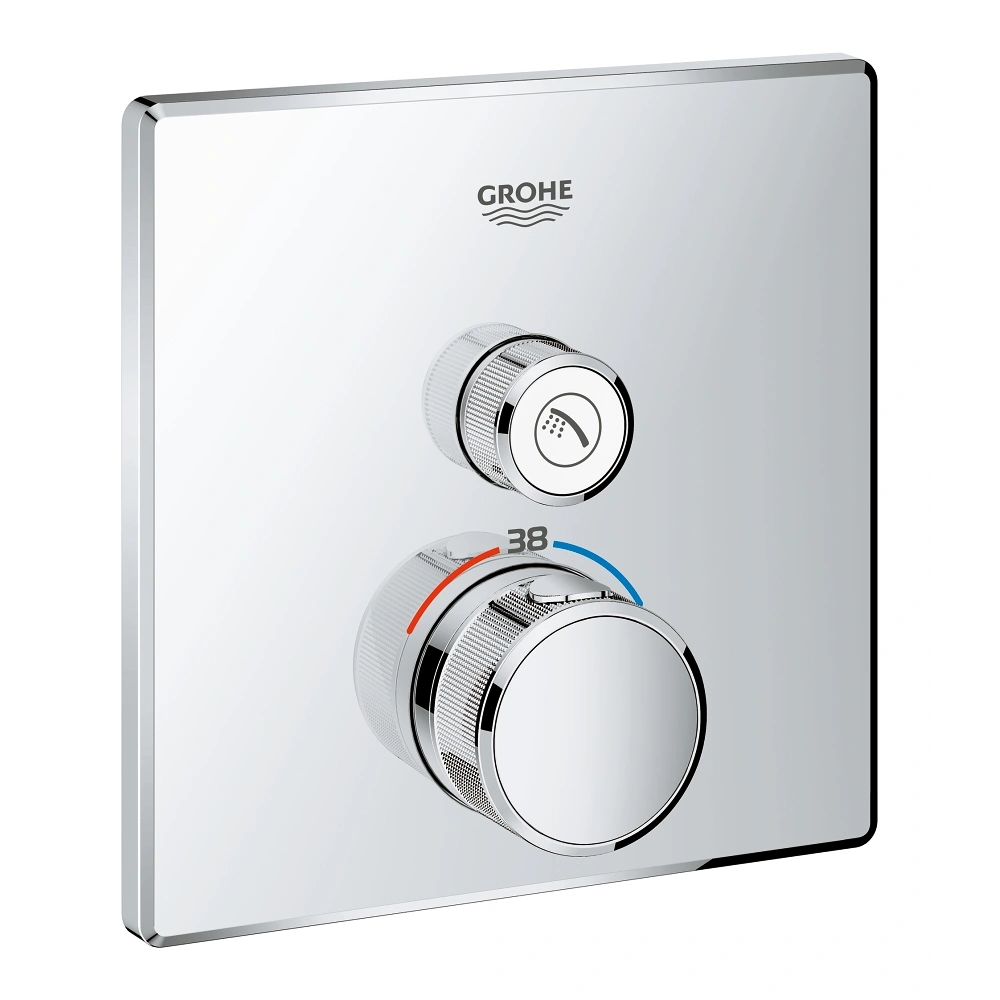 Alle productinformatieDe thermostatische mengkraan met een afsluiter is uitgerust met een ingebouwde terugstroombeveiliger en zeef. De metalen wandrozet met GROHE QuickFix heeft een verborgen rozet- en asafdichting. De bevestiging wordt vervolgens uitgelijnd met 6° en ook afgedekt. Het water wordt met één druk op de knop in- en uitgeschakeld en de hoeveelheid wordt ingesteld door te draaien. Het symbool van de knop is uitwisselbaar. De temperatuurregelaar heeft het GROHE SafeStop-veiligheidsblokkering, dat begint bij 38°C om verbranding te voorkomen. Door op de knop van de GROHE SafeStop Plus te drukken, kan ook een temperatuurbegrenzing tot 43°C worden ingesteld. De GROHE TurboStat-compactcartridge zorgt ervoor dat de gewenste temperatuur snel wordt bereikt en constant blijft. Het GROHE StarLight-oppervlak is gemakkelijk te reinigen en ongevoelig voor krassen.